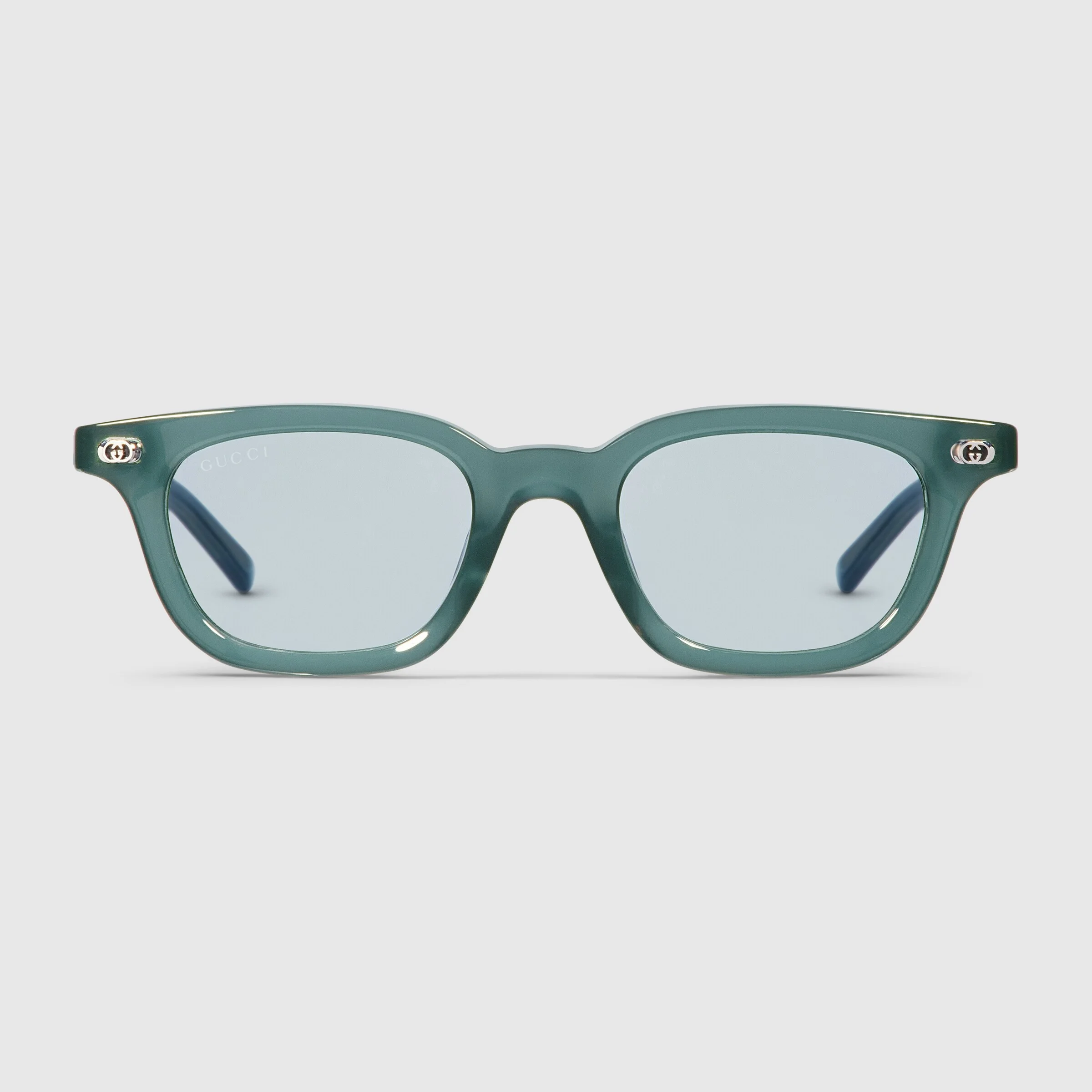 The Pre-Fall 2025 eyewear collection successfully combines the coveted silhouettes of bygone decades with a contemporary logo feel. Here, this opal blue acetate frame pairs with an Interlocking G and engraved Gucci logo. - Shiny opal blue acetate frames with Interlocking G - Shiny opal blue acetate temples with engraved Gucci logo on temples - Light blue-to-grey transition lens - 100% UVA/UVB protection - GG1946S - Temple length: 5.5"; Lens height: 1.3", Nose bridge length: 0.8" - Frame height: 1.6"; Frame width: 5.6"; Hinge to hinge: 5.1" - The glasses will arrive in a velvet case, available in a range of six jewel-toned colors and paired with a coordinating satin lining. The case color will be individually selected for each pair of glasses and comes with a matching satin flannel pouch and ivory microfiber cloth.