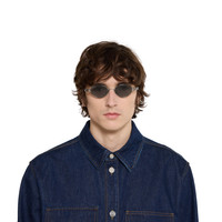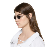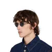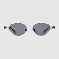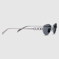 The Pre-Fall 2025 eyewear collection blends statement silhouettes from the archives with a contemporary touch. These oval frame sunglasses are stated in light ruthenium metal with a cut-out Gucci logo detail. - Shiny light ruthenium metal frames - Shiny light ruthenium metal temples with cut-out Gucci logo - Solid grey lens - 100% UVA/UVB protection - GG1935S - Temple length: 4.9"; Lens height: 1.3", Nose bridge length: 0.7"; Hinge to hinge: 5.3" - Frame height: 1.3"; Frame width: 5.6" - The glasses will arrive in a velvet case, available in a range of six jewel-toned colors and paired with a coordinating satin lining. The case color will be individually selected for each pair of glasses and comes with a matching satin flannel pouch and ivory microfiber cloth.