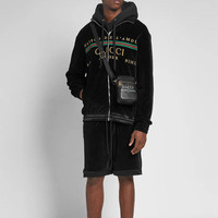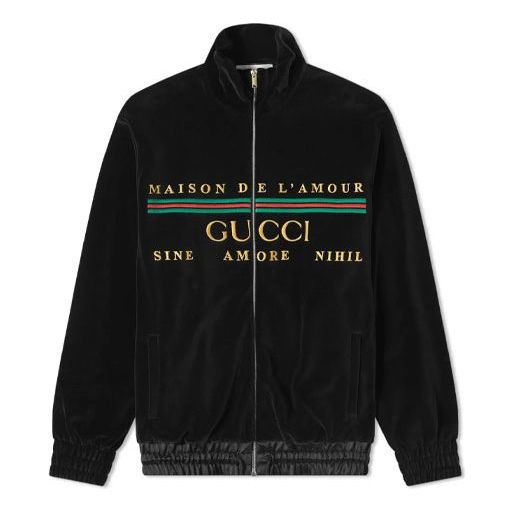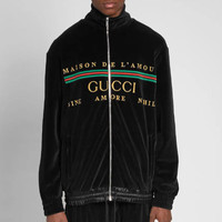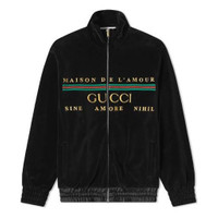 Featuring romantic mottos that have become synonymous with the House, a Gucci "Maison de l'Amour" and "Sine Amore Nihil" embroidery decorates the front of this black chenille tracksuit jacket, designed with an oversize fit and tonal acetate trims. Influences drawn from the sportswear and leisurewear worlds collide into an inherently Gucci style juxtaposing athletic inspired shapes with soft, refined fabrics. - Black cotton chenille - Black acetate trim - Gucci "Maison de l'Amour" and "Sine Amore Nihil" embroidery - Mesh lining - Zip pockets - Elastic cuffs - Elastic waistband with drawstring - Zip closure - Oversize fit - 85% cotton and 15% polyamide - Made in Italy - The model is 6' and is wearing size small