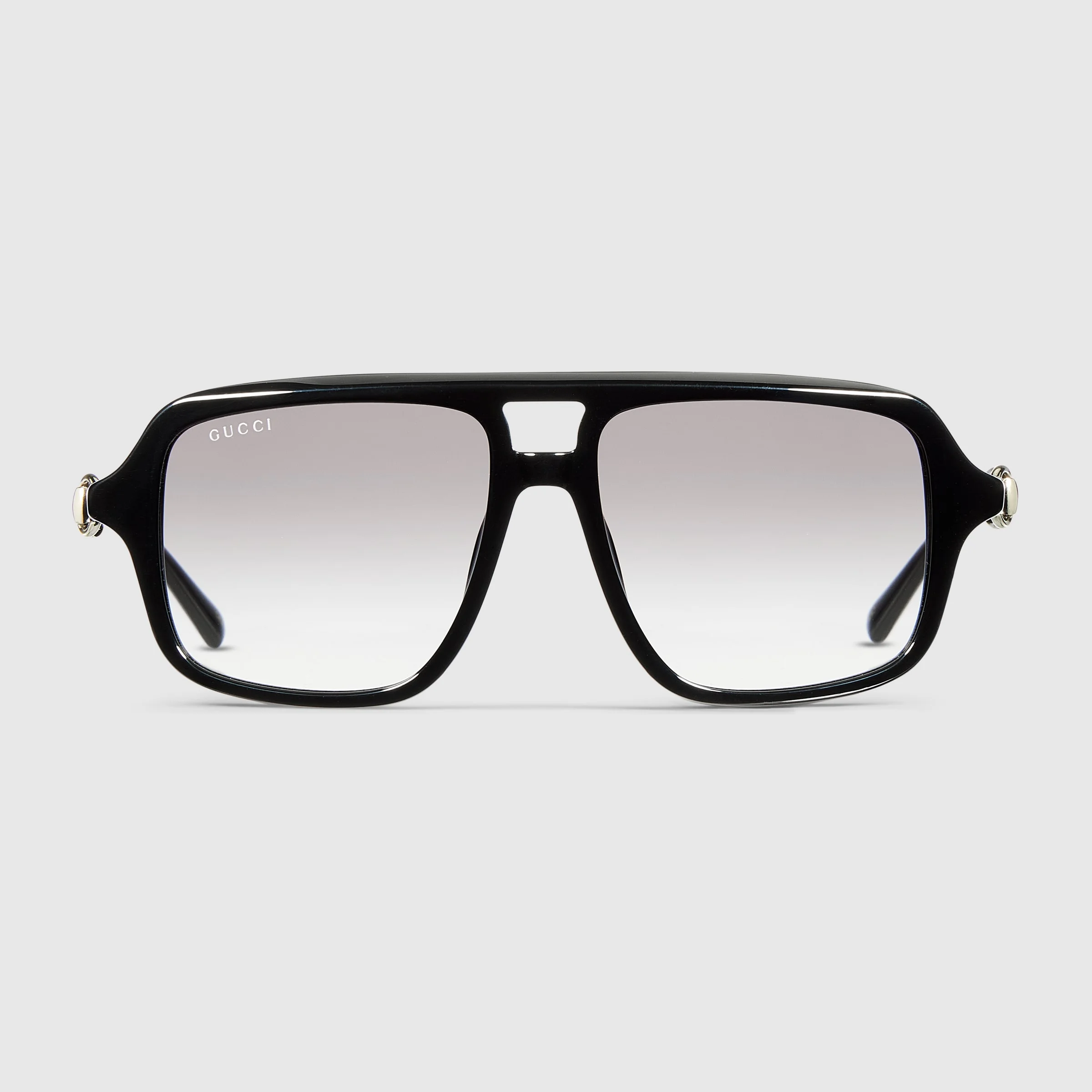 The House's eyewear collection continues to reinterpret emblematic motifs, from the GG, Web, bamboo, Horsebit and equestrian inspirations, in sumptuous materials, intricate craftsmanship, and fresh hues. These oversize navigator sunglasses are presented in black acetate and reveal a shiny dark ruthenium Horsebit detail across the temples. - Shiny black acetate frame - Shiny black acetate with shiny dark ruthenium Horsebit detail - Gradient grey lens - 100% UVA/UVB protection - GG2046S - Temple length: 5.7"; Lens height: 1.8"; Nose bridge length: 0.6" - Frame height: 5.6"; Frame width: 2"; Hinge to hinge: 5.4" - The eyewear case in the House’s signature Rosso Ancora red hue is complete with a magnetic closure and white interior