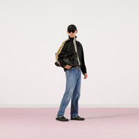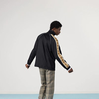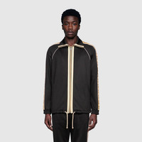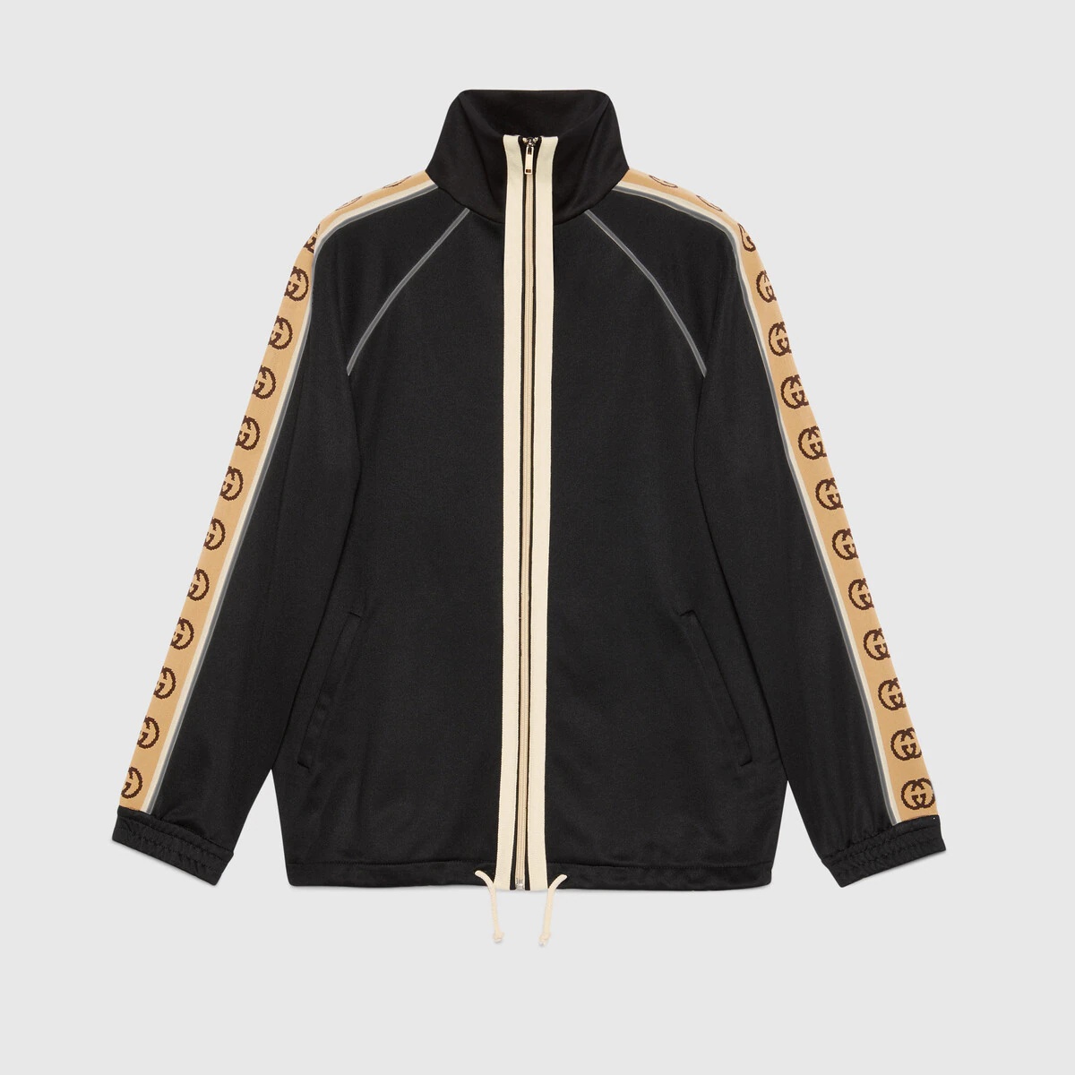 A distinctive detail of the Cruise 2020 collection, the Interlocking G stripe runs down the sleeves of this oversize jacket, crafted from black technical jersey. Reminiscent of logo tapes typically found on vintage tracksuits, the side band serves as a sporty play on the historical Gucci logo. - Black technical jersey - White trims - Camel and brown Interlocking G jacquard stripe down the sleeves with reflective fabric piping - Zip pockets - Elastic cuffs - Drawstring at the waist - Zip front - Oversize fit - Made in Italy - The model is 6'2" and is wearing size small