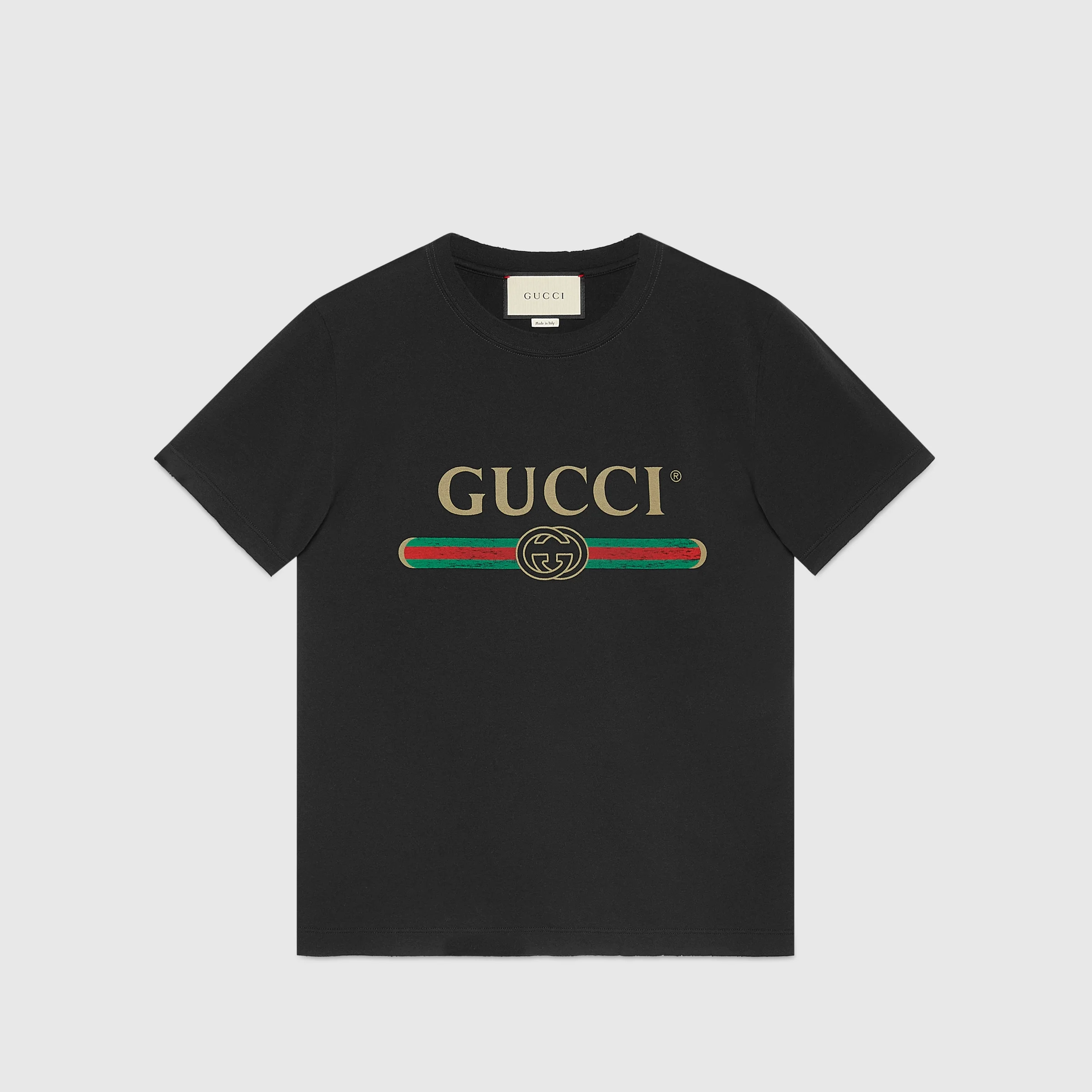 The House brings the Gucci logo to the forefront, inspired by vintage prints from the eighties. The retro-style motif is presented on an oversize T-shirt style made in washed cotton jersey with small holes in the fabric for a vintage effect. - Black washed cotton jersey with Gucci vintage logo - Crewneck - Oversize fit - Made in Italy - The model is 188cm and is wearing size medium