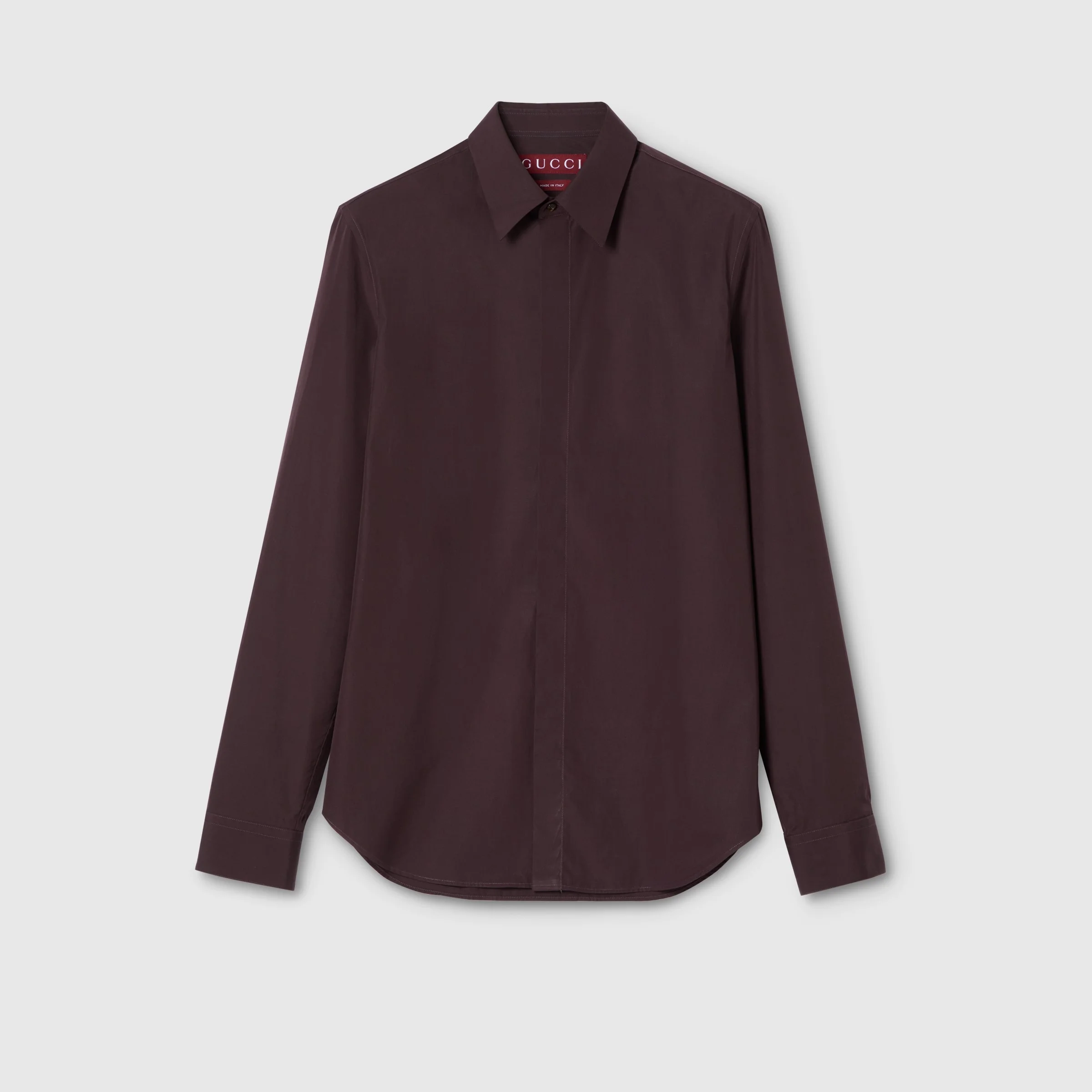 Silhouettes, fabrics, and craftsmanship draw from the House codes and speaks to the present without losing sight of the heritage. Crafted from burgundy piece dyed poplin, this shirt is decorated with an Interlocking G embroidery. - Burgundy piece dyed poplin - Interlocking G embroidery - Point collar - Long sleeves - Front button closure - Length :29.9"; Sleeves: 35.4"; based on size 15++
