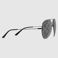Introducing Spring Summer 2026. Distinctive eyewear shapes are enriched with emblematic signatures that create a fil rouge in the collection. This style is featured in several looks of La Famiglia. Presented with a black metallic frame, it features an Interlocking G detail across the temples and a mirrored Guccissima lens. - Black metallic frame - Black metallic temples with an Interlocking G detail - Black mirrored silver Guccissima lens - 100% UVA/UVB protection - Adjustable nose pads - GG2172S - Temple length: 5.5"; Lens height: 2.2"; Nose bridge length: 0.6" - Frame height: 2.2"; Frame width: 5.9"; Hinge to hinge: 5.7" - Made in Japan - The eyewear case in black is complete with a magnetic closure and GG motif interior.