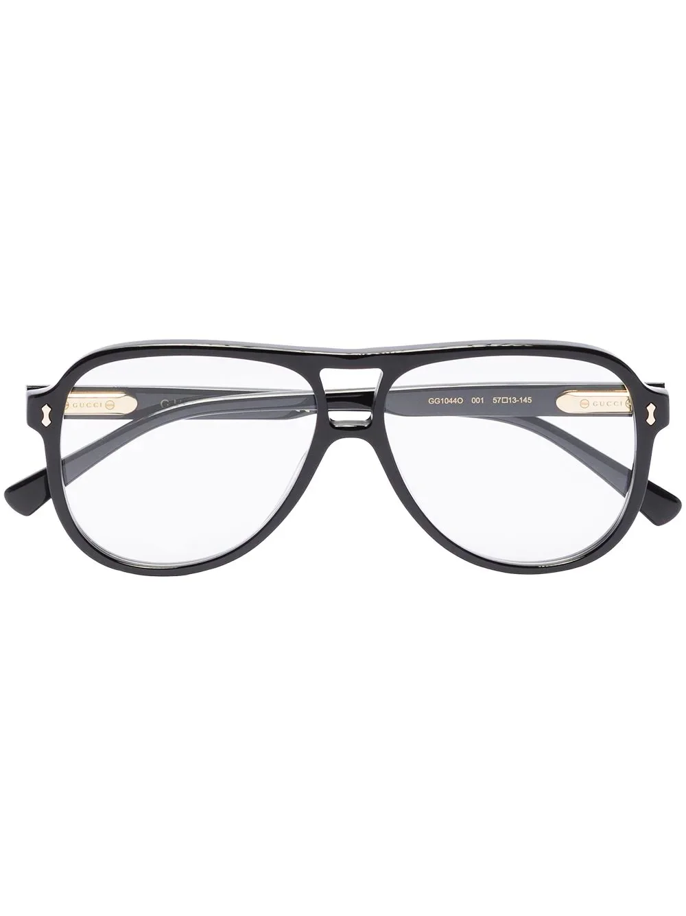 pilot frame glasses In a versatile black colour and retro-inspired oversized look, these glasses from Gucci Eyewear's AW21 collection feature an pilot frame and a double nose bridge and are complete with refined gold-tone hardware. Made in Italy Composition Acetate 100% SIZE & FIT Model measurements Height 6 ft 3 in(1.9 m) Bust/Chest 34.64 in(88 cm) Hips 34.64 in(88 cm) Waist 26.37 in(67 cm) Measurement Arm Length 5.7 in(14.5 cm) Bridge Width 0.51 in(1.3 cm) Lens Diameter 2.24 in(5.7 cm)