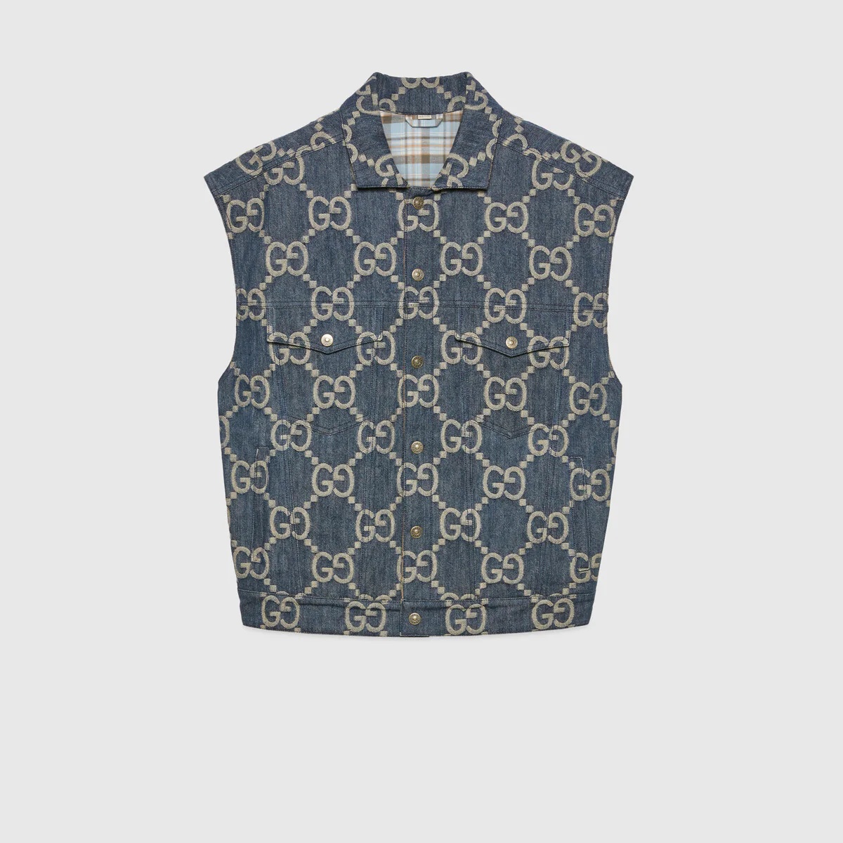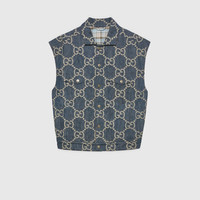 Instantly recognizable emblems of the brand, logos enrich designs in new and unexpected ways. Behind every logo lies the tradition and value of the House, an everlasting medium one can wear again and again. Following the idea of constant change and experimentation, different iterations of the logo have been presented each collection. The Jumbo GG, a new, maximalist version of the historic monogram, animates a selection of ready-to-wear and accessories for the Aria collection such as this vest. - Blue and ivory jumbo GG jacquard denim - Snap button closure - Raw cut edges - Front pockets - Length: 26.4", based on a size 48 (IT) - Made in Italy - The model is 5'7" tall. The product shown in this image is a size 48 (IT)