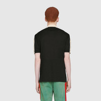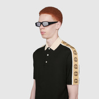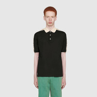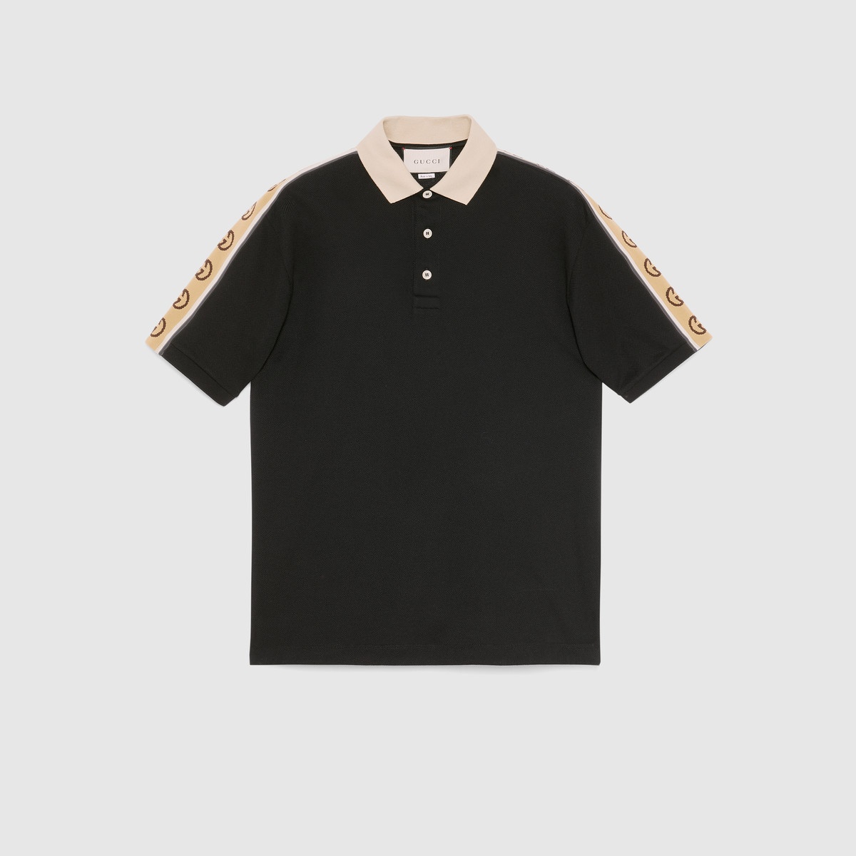 A distinctive detail of the Cruise 2020 collection, the Interlocking G stripe runs down the sleeves of this black stretch cotton piquet polo, with beige contrast collar. Reminiscent of logo tapes typically found on vintage tracksuits, the side band serves as a sporty play on the historical Gucci logo. - Black stretch cotton piquet - Beige collar - Camel and brown Interlocking G jacquard stripe down the sleeves with reflective fabric piping - Short sleeves - Button-through placket with mother of pearl buttons - Made in Italy - The model is 6'2" and is wearing size small