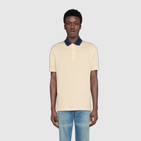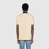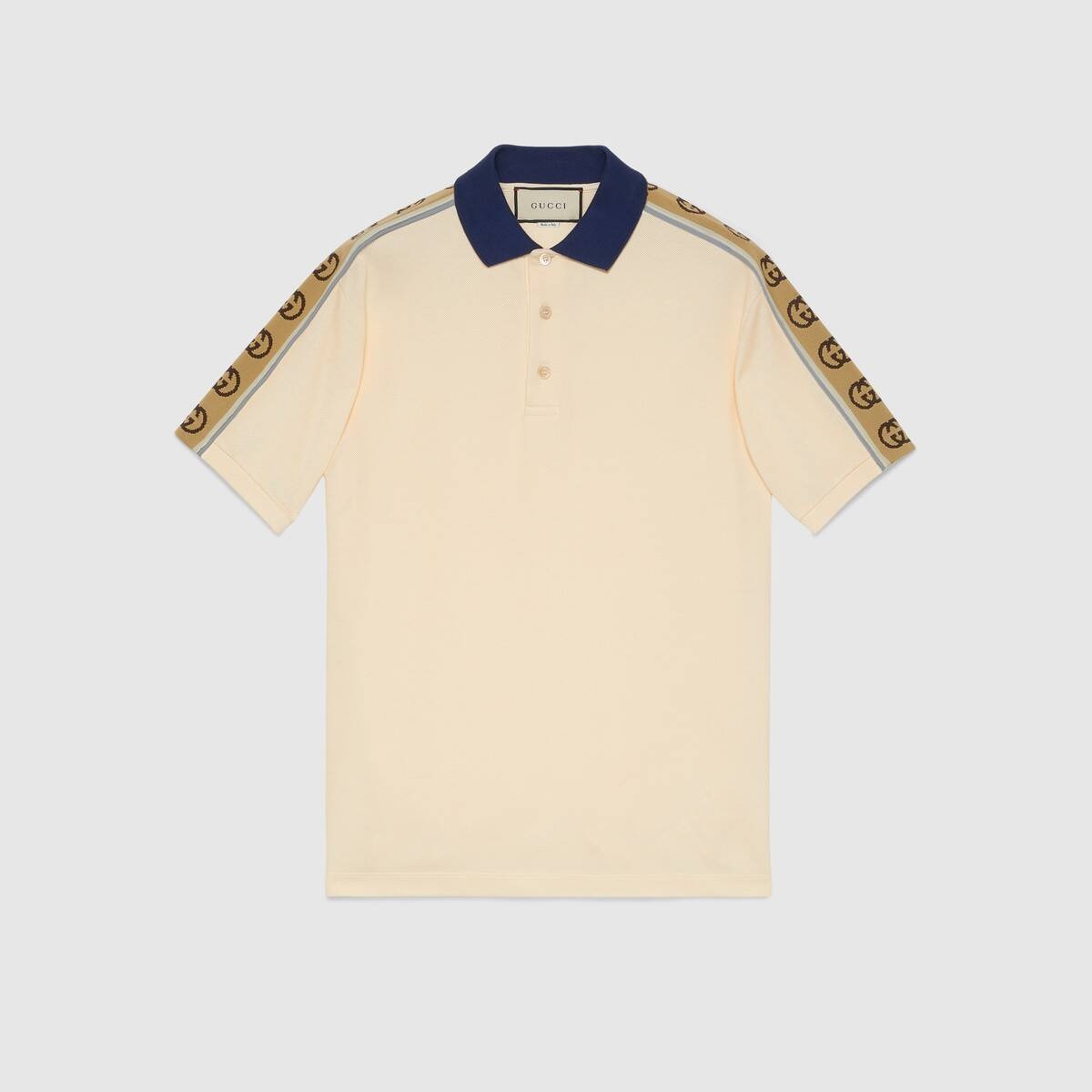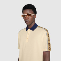 A distinctive detail of the Cruise 2020 collection, the Interlocking G stripe runs down the sleeves of this off-white stretch cotton piquet polo, with blue contrast collar. Reminiscent of logo tapes typically found on vintage tracksuits, the side band serves as a sporty play on the historical Gucci logo. - Off-white stretch cotton piquet - Blue collar - Camel and brown Interlocking G jacquard stripe down the sleeves with reflective fabric piping - Short sleeves - Button-through placket with mother of pearl buttons - Made in Italy - The model is 6'2" and is wearing size small