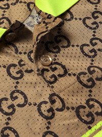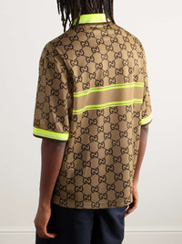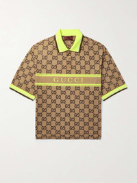 Gucci amps up the sportswear feel with this breathable mesh polo shirt. Made in Italy, it's printed with a repeating 'GG' motif and is trimmed with bright neon yellow to match the brand name across the front. Size & Fit - Fits true to size. Take your normal size - Designed for a regular fit - Lightweight, non-stretchy fabric - Model is shown wearing a M - Model measures: chest 38"/ 96cm, height 6'0"/ 183cm Details & Care - Tonal-brown and neon-yellow mesh - Button fastenings - 100% polyester - Hand wash