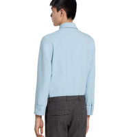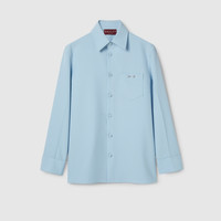 In the Fall Winter 2025 collection, Gucci's classic codes meet a streamlined silhouette. This slim fit shirt is enriched by a metal Horsebit detail on the chest pocket. The style is completed by a concealed button closure, point collar and long sleeves. - Light blue polyester twill - Point collar - Long sleeves - Chest pocket with Horsebit - Regular fit - Total length: 28.3"; Shoulder: 17.9"; Chest: 20"; Sleeve length: 25.9"; Neck width: 15.9" (size 46 IT)