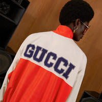 With Gucci Love Parade, the Creative Director rewrites the rules of on-the-go fashion. Activewear-inspired pieces animate the collection through a series of neon hues and new colorful versions of the Gucci logo. This orange and ivory zip up jacket has net mesh lining and Gucci print on the back. - Orange and ivory polyester fabric - Blue Interlocking G print on the front - Blue 'Gucci' print on the back - Net mesh lining - Rib trim - Two side zip pockets - Zip closure - Made in Italy - The product shown in this image is a size large