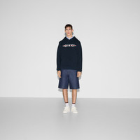 Gucci's House codes continue to evolve for the new season across jersey pieces. This regular fit hooded sweatshirt is presented in cotton jersey and reveals a Gucci Web print. - Navy cotton jersey - Gucci Web print - Fixed hood with drawstring - Dropped shoulder - Kangaroo pocket - Rib trim - Shoulder drop: 20.8"; based on a size S - Chest: 22.8"; based on a size S - Sleeves length: 25"; based on a size S - Regular fit - Length: 26.7"; based on a size S - Made in Italy - The product shown in this image is a size small