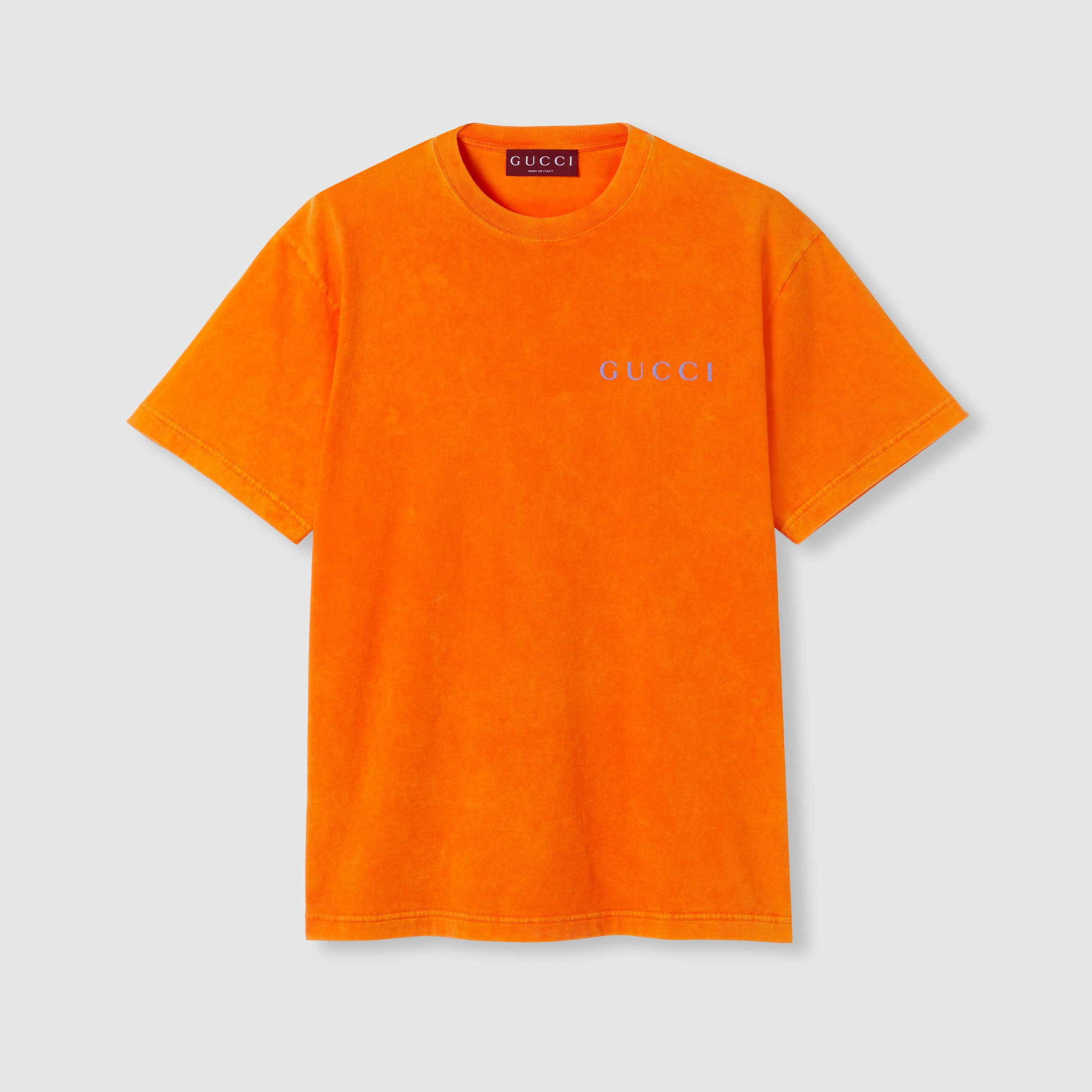 In the Spring Summer 2025 collection, subtle House codes appear throughout the new season across jersey pieces. This regular fit T-shirt has been crafted from a garment-dyed cotton jersey and enriched with a Gucci logo print across the chest. - Orange cotton jersey garment-dyed - Gucci logo print - Crewneck - Dropped shoulder - Short sleeves - Regular fit - Length: 28.9"; Shoulder: 19.7"; Chest: 22"; Sleeves length: 8.5"; based on a size M - Made in Italy - The product shown in this image is a size small