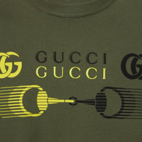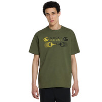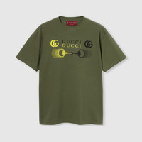 The Pre-Fall 2025 collection elevates the everyday wardrobe with a mix of textures, motifs and colors from Horsebit print silk separates to crochet-knit shirts. Crafted from forest green cotton jersey, this regular fit T-shirt is defined by a Double G and Horsebit print. - Forest green cotton jersey - Double G and Horsebit print - Gucci embroidery - Crewneck - Dropped shoulder - Short sleeves - Rib trim - Regular fit - Length: 28.9"; Shoulder: 19.7"; Chest: 22"; Sleeves length: 8.5"; based on a size M - Made in Italy
