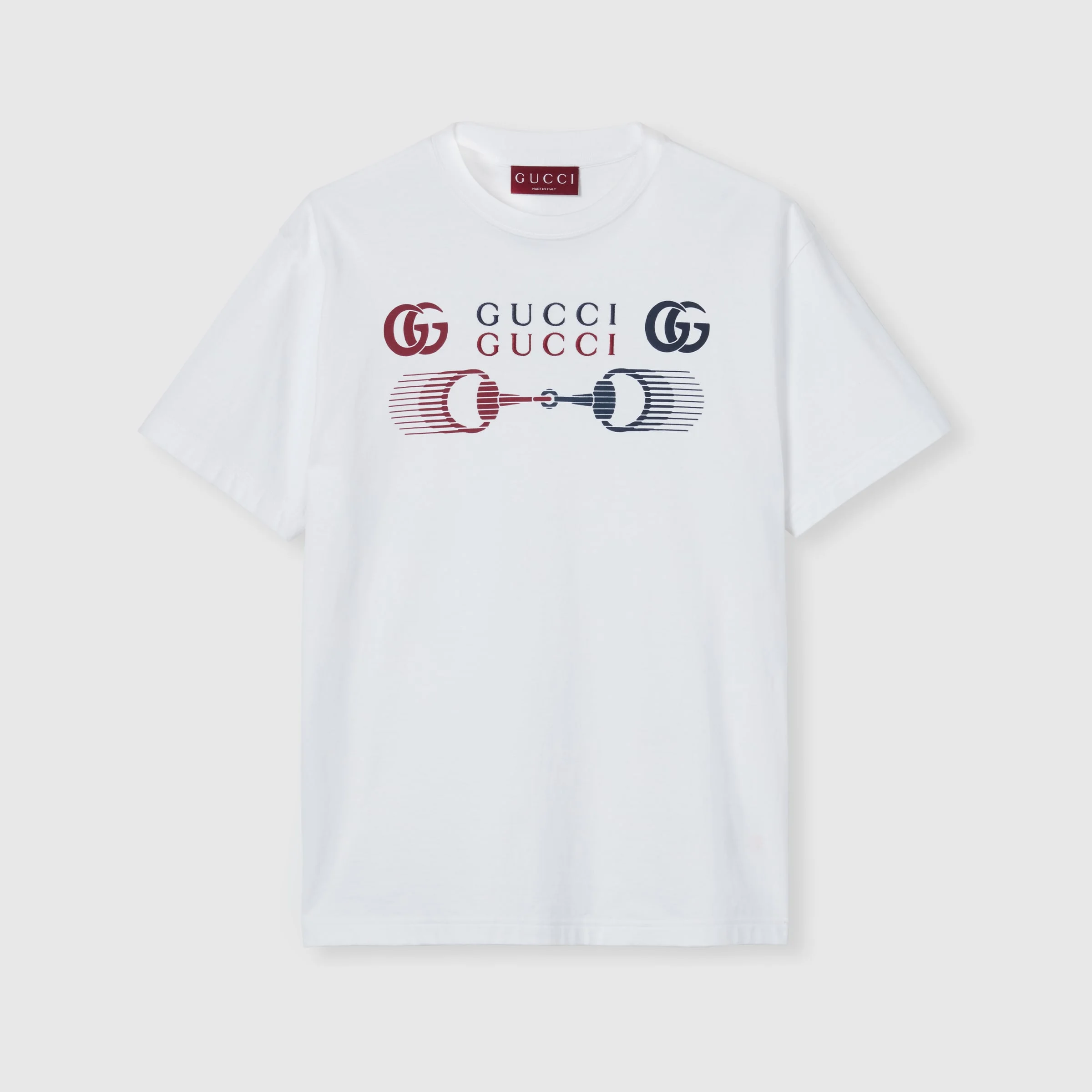 A selection of ready-to-wear pieces is enriched with heritage details of the House. This regular fit T-shirt is presented in white cotton jersey and is defined by a Double G with Horsebit print, finished with a subtle logo embroidery. - White cotton jersey - Double G and Horsebit print - Gucci embroidery - Crewneck - Dropped shoulder - Short sleeves - Rib trim - Regular fit - Length: 28.9"; Shoulder: 19.7"; Chest: 22"; Sleeves length: 8.5"; based on a size M - Made in Italy