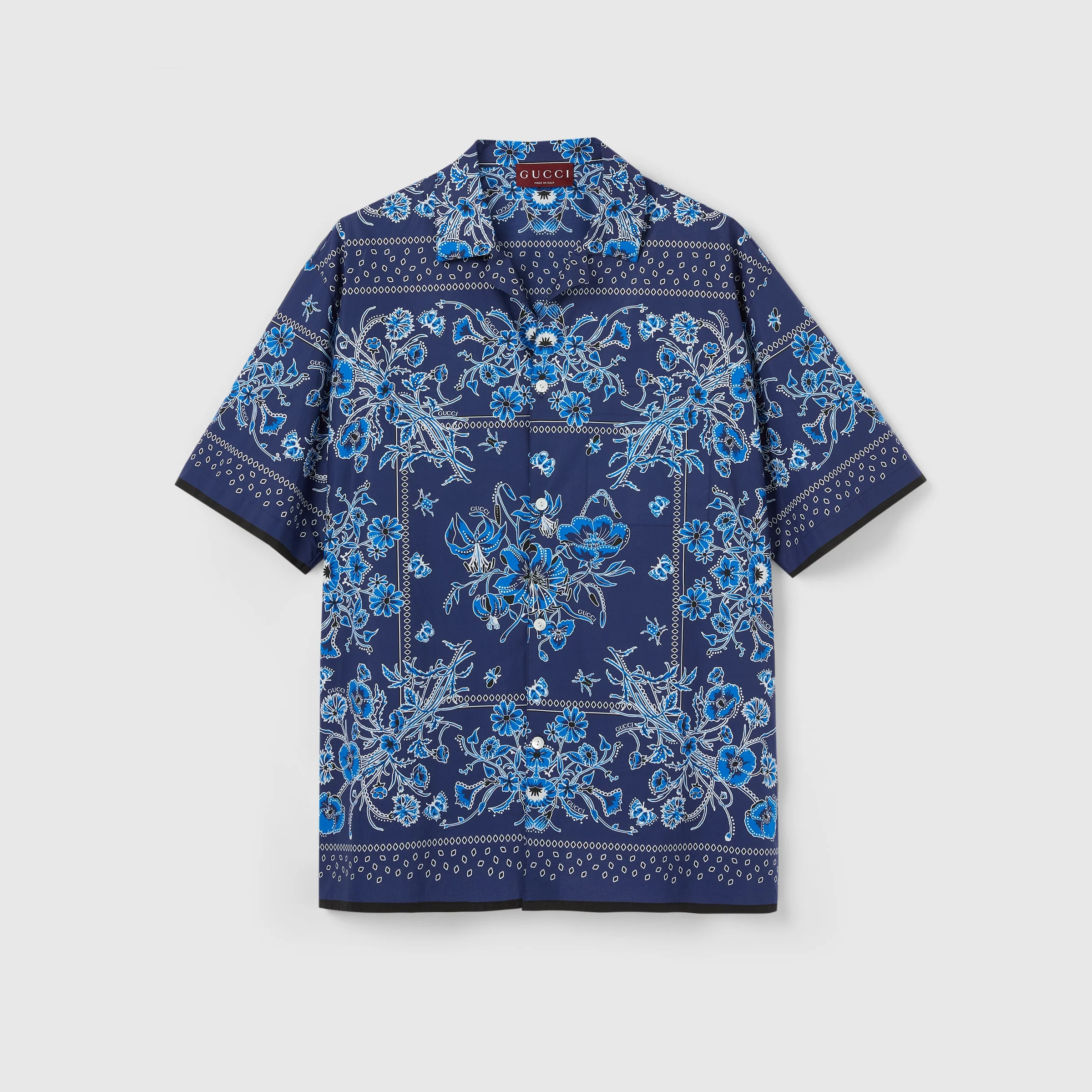 For the Pre-Fall 2025 collection, a selection of ready-to-wear pieces is defined by a bohemian feel in colorful prints and relaxed silhouettes. Crafted from blue cotton poplin, this regular fit shirt is defined by an allover bandana print. - Blue cotton poplin - Allover floral bandana print and Gucci logo print - Notch collar - Dropped shoulder - Short sleeves - Chest pocket - Side slits - Button closure - Regular fit - Length: 29.5"; Shoulder: 20.1"; Chest: 46.9"; Sleeves length: 20.9"; based on a size 48 IT - Made in Italy