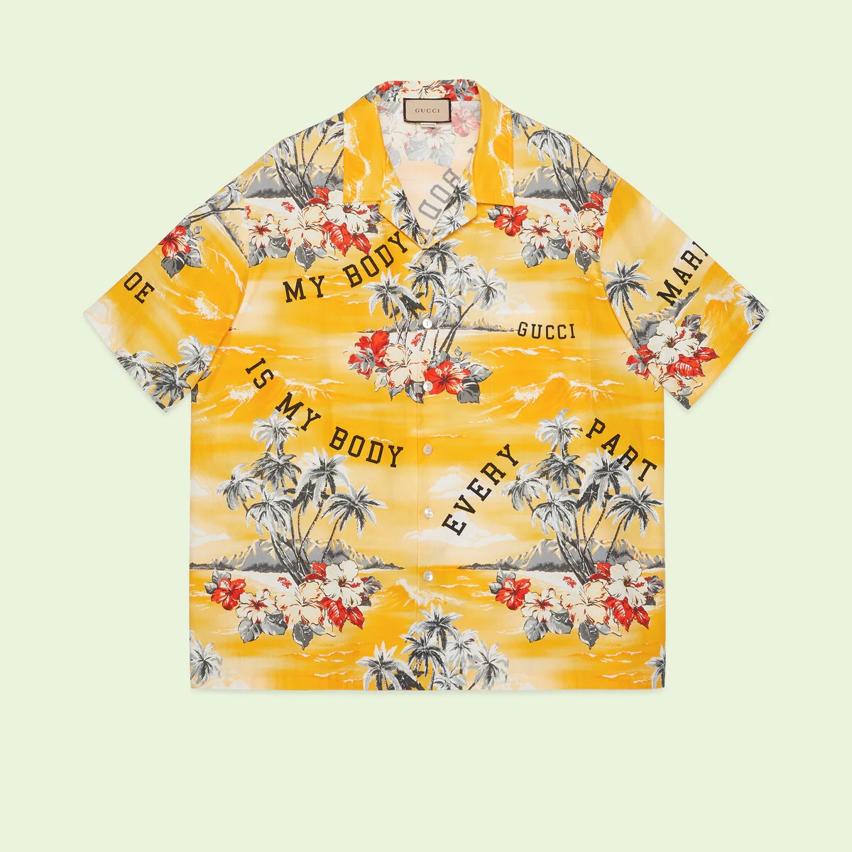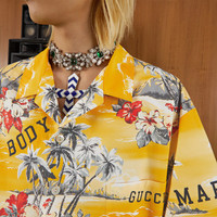 Pursuing the concept of escapism and faraway destination, Gucci Love Parade presents a series of pieces inspired by travel to warm places. Prints recalling typical souvenir designs, create playful yet elegant ready-to-wear pieces. - Yellow and red cotton poplin - Island print with 'My body is my body every part of it' —Poetry by Marilyn Monroe: Copyright LSAS, International all rights reserved. - Short sleeves - Pointed collar - Front patch pocket - Mother of pearl buttons - Made in Italy - The product shown in this image is a size 52 (IT)