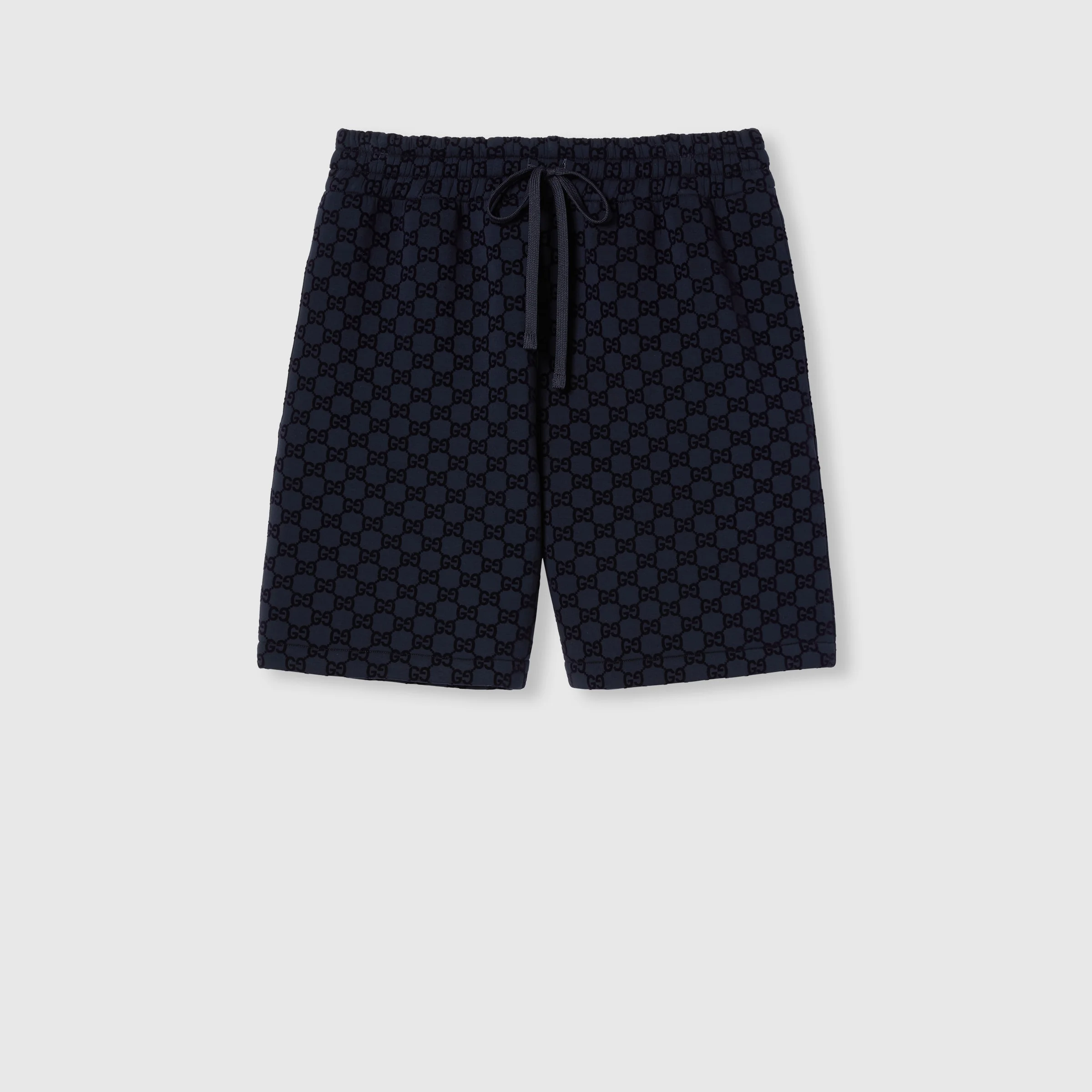 A selection of ready-to-wear pieces is enriched with heritage details of the House. Crafted from navy double jersey viscose, this pair of shorts is defined by an allover GG flock print. - Navy double jersey viscose - Allover GG flock print - Web loop detail - Elastic waist with drawstring - Back pocket - Length: 19.7"; Waist: 15.9"; Hips: 24"; Hem width: 14.2"; based on a size M - Made in Italy