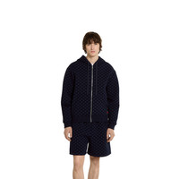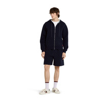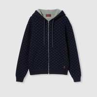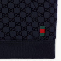 A selection of ready-to-wear pieces is enriched with heritage details of the House. Crafted from navy double jersey viscose, this zip jacket is defined by an allover GG flock print. - Navy double jersey viscose - Allover GG flock print - Web loop detail - Fixed hood - Dropped shoulder - Long sleeves - Kangaroo pocket - Rib trim - Zip closure - Regular fit - Length: 27.6"; Shoulder: 21.3"; Chest: 23.6"; Sleeves length: 25.4"; based on a size M - Made in Italy