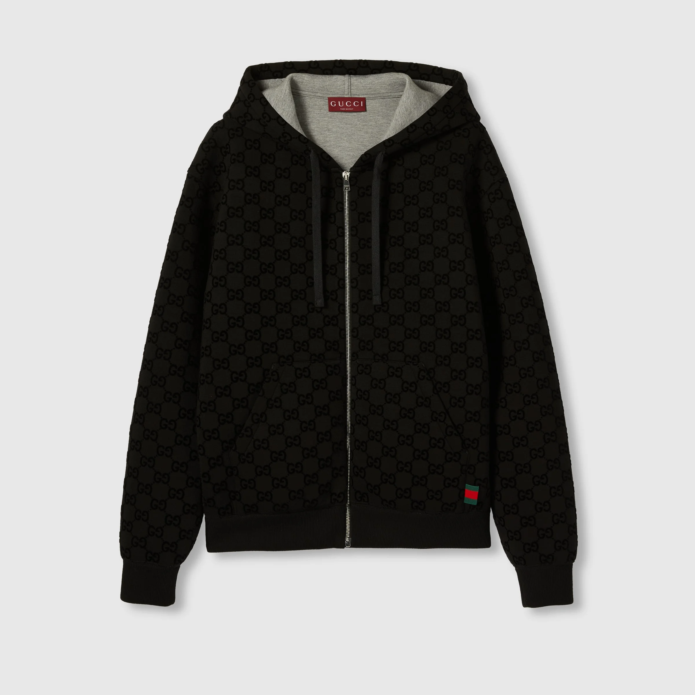 Taking inspiration from founder Guccio Gucci's monogram, the GG motif continues to be a firm favorite of the House. This regular fit hooded sweatshirt has been made from a viscose jersey and is defined by an allover GG flock print. A green and red Web loop detail completes the silhouette. - Black viscose jersey - Allover GG flock print - Fixed hood - Dropped shoulder - Long sleeves - Kangaroo pocket - Web loop detail - Rib trim - Zip closure - Regular fit - Made in Italy - The product shown in this image is a size small