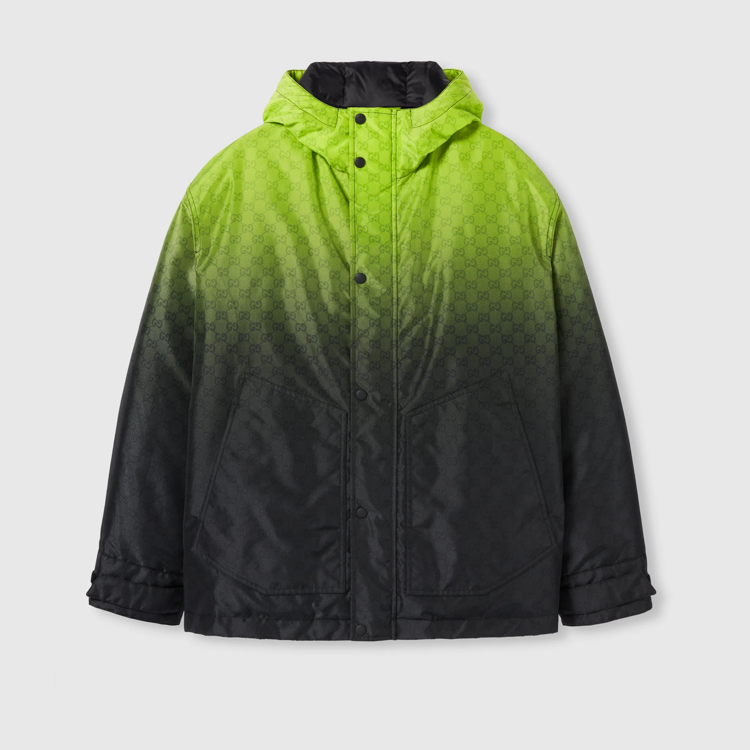 Gradient colors are meticulously created to bring out the texture of the materials and the recognizable GG motif. Crafted from gradient lime to green nylon, this padded jacket is defined by an allover GG print with degrade effect. - Gradient lime to green nylon - Allover GG print with degrade effect - Padded - Fixed hood - Front pockets - One inside zip pocket - Zip and button closure - Made in Italy