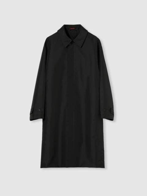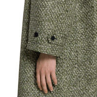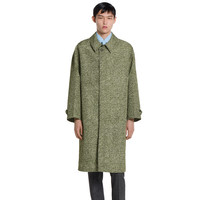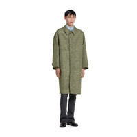 In the Fall Winter 2025 collection, essential and sharp lines define the silhouette through refined fabrics and classic British tailoring elements. This long coat stands out for its unlined construction and structured volume, enhanced by ironed creases on the sleeves and toggle details at the cuffs. - Dark green technical polyester bonded poplin - Allover moss boucle print - Unlined - Side welt pockets - Toggle details on cuffs - Back vent - Ironed creases on sleeves - Horn button closure - Regular fit - Total length: 45.2"; Shoulder: 24.8"; Chest: 27.1"; Sleeve length: 36.2"; (size 50 IT)