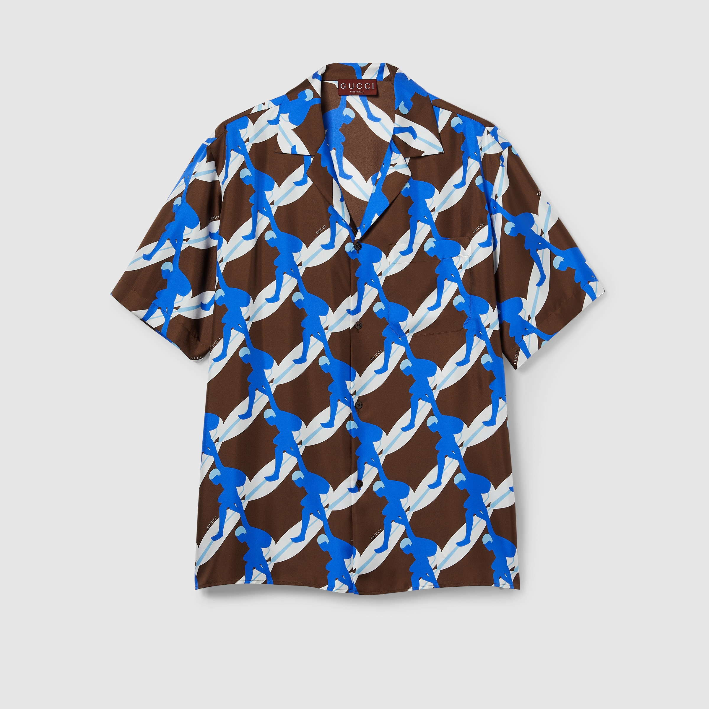In the Spring Summer 2025 collection, shirts feature infinity prints with surfers, dolphins, hibiscus flowers, and banana leaves. This variation in brown, white and blue silk features an allover surfer print with mother-of-pearl buttons. - Brown, white and blue silk twill - All over surfer print - Mother-of-pearl buttons - Notch collar - Short sleeves - Chest pocket - Side slits - Button closure - Length: 29.5"; Shoulder: 20.1"; Chest: 46.9"; Sleeves length: 20.9"; based on a size 48 IT - Made in Italy - The product shown in this image is a size 48 (IT)