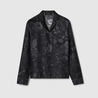 Introducing Spring Summer 2026. This style is inspired by the "Principino" look of La Famiglia. The collection reinterprets the House’s codes through singular personalities and distinctive aesthetic attitudes. Crafted from silk twill, this bowling shirt is defined by an allover Gucci Flora print. - Black and grey silk twill - Allover Gucci Flora print - Open collar - Long sleeves - Front button closure - Length: 24.8"; Sleeves length: 33.46", based on a size 44(IT) - Made in Italy - Fabric: 100% Silk - Pocket lining: 100% Viscose