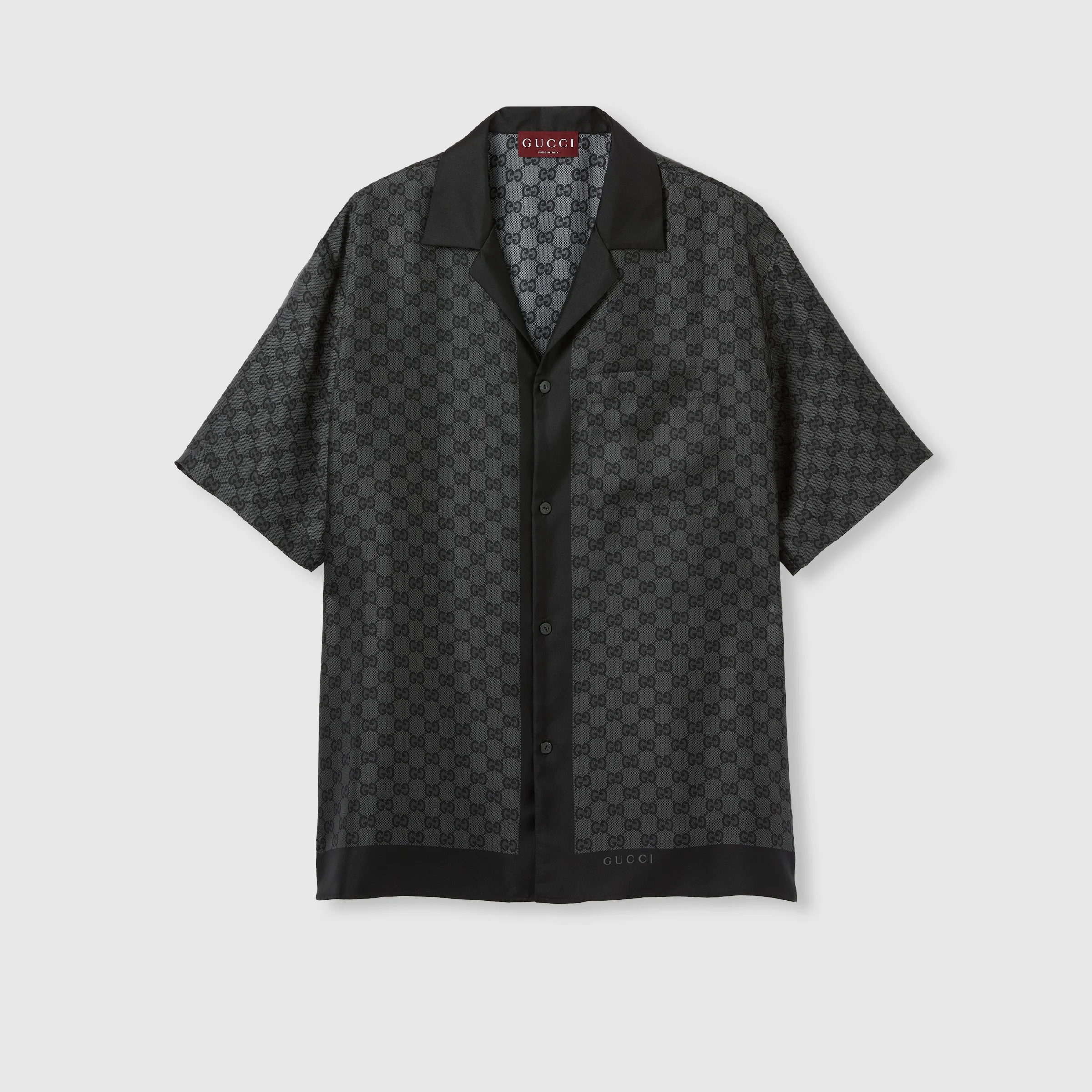 The Pre-Fall 2025 collection elevates the everyday wardrobe with a mix of textures, motifs and colors. Crafted from grey and black silk twill, this regular fit shirt features an allover GG print. - Grey and black silk twill - Allover GG print - Notch collar - Dropped shoulder - Short sleeves - Chest pocket - Side slits - Button closure - Regular fit - Length: 29.5"; Shoulder: 20.1"; Chest: 46.9"; Sleeves length: 20.9"; based on a size 48 IT - Made in Italy