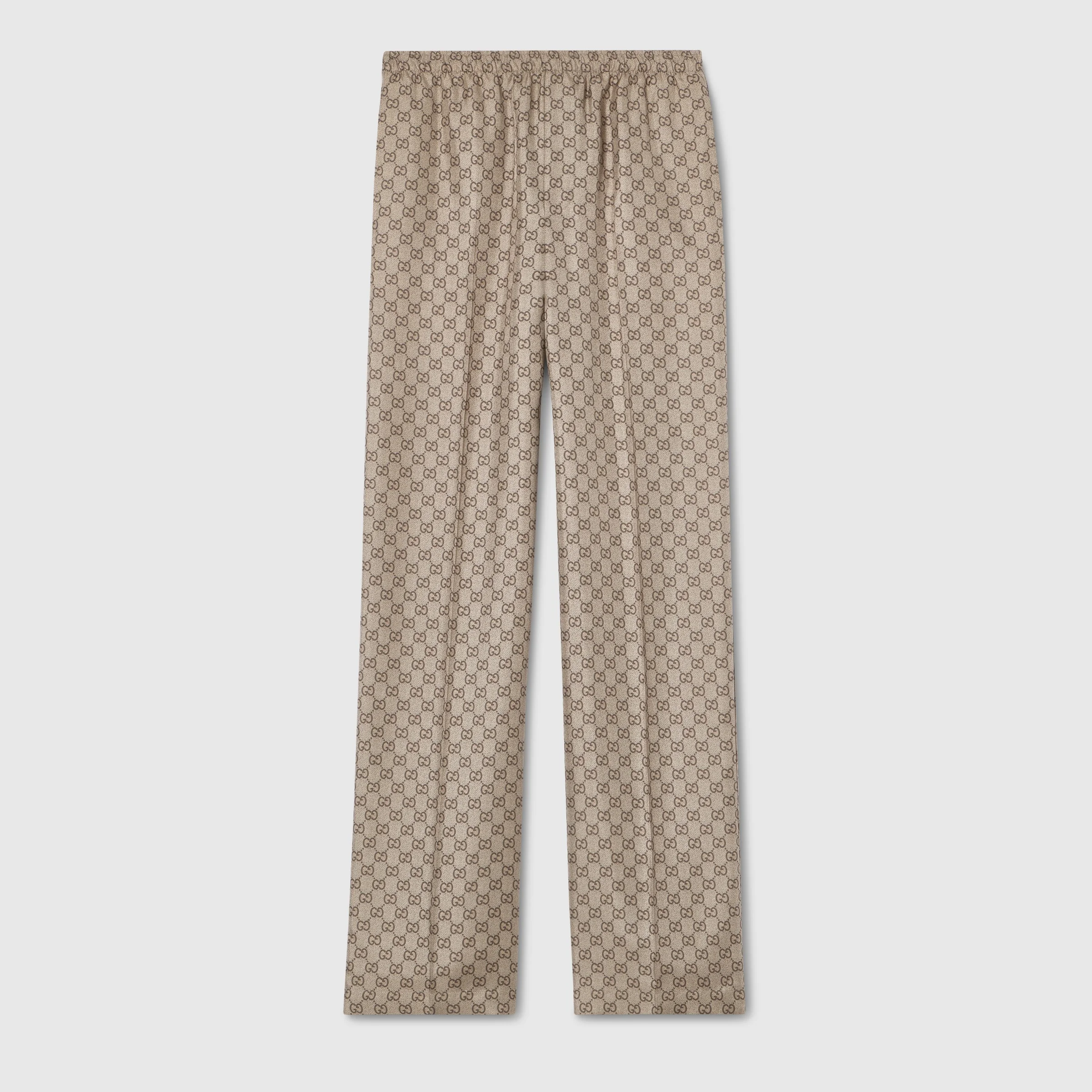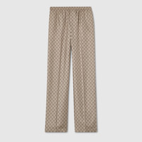Introducing Spring Summer 2026. This style is inspired by the "Principino" look of La Famiglia. The collection reinterprets the House’s codes through singular personalities and distinctive aesthetic attitudes. Crafted from silk twill, this pair of pants is defined by an allover GG print. - Beige and and dark brown silk twill - Allover GG print - Elastic waistband with drawstring - Single back pocket - Length: 45.27"; Leg opening: 9.44", based on a size 44(IT) - Made in Italy - Fabric: 100% Silk - Pocket lining: 100% Viscose