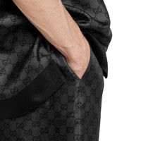The Pre-Fall 2025 collection elevates the everyday wardrobe with a mix of textures, motifs and colors. Crafted from grey and black silk twill, this pair of shorts features an allover GG print. - Grey and black silk twill - Allover GG print and Gucci logo print - Elastic waist with drawstring - Two side pockets - Two back pockets - Length: 21.7"; Waist: 16.3"; Hips: 22.4"; Hem width: 13.8"; based on a size 48 IT - Made in Italy