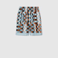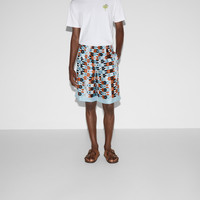 Gucci's House codes continue to evolve for the new season. Crafted from a silk twill, these shorts are enriched with a geometric Horsebit print, paying homage to the House's rich equestrian heritage. - Multicolor silk twill - Allover geometric Horsebit print - Elastic waist with drawstring - Two side pockets - Two back pockets - Length: 21.7"; Waist: 16.3"; Hips: 22.4"; Hem width: 13.8"; based on a size 48 IT - Made in Italy