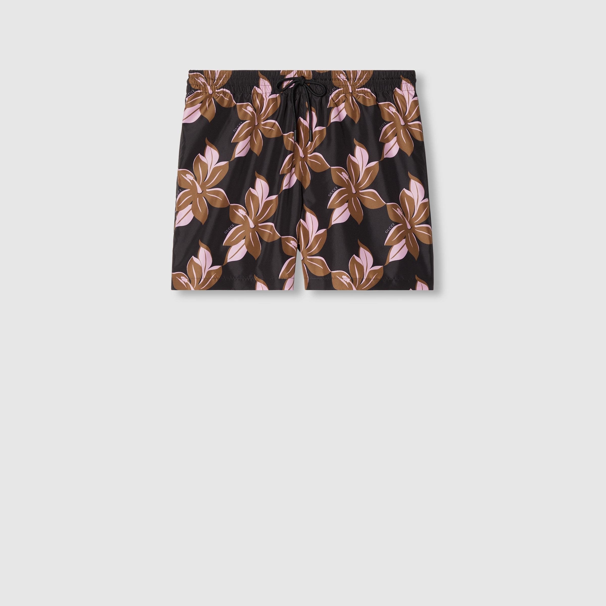 In the Spring Summer 2025 collection, swim shorts feature infinity prints with surfers, dolphins, hibiscus flowers, and banana leaves. This variation in brown and pink technical poplin features an allover flower print with an elastic waistband with drawstring. - Dark brown and pink technical poplin - All over flower print - Mesh lining - Elastic waist with drawstring - Two side pockets - Back pocket - This item comes with a matching pouch - Please note that intimates, including swimwear, tights, socks and lingerie can only be returned in new condition. Items should be unworn, in their original packaging and with all labels attached. - Length: 15.4"; Waist: 16.3"; Hips: 21.7"; Hem width: 12.8"; based on a size 48 IT - Made in Italy - The product shown in this image is a size 48 (IT)