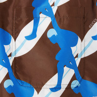 In the Spring Summer 2025 collection, swim shorts feature infinity prints with surfers, dolphins, hibiscus flowers, and banana leaves. This variation in brown, blue and white technical poplin features an allover surfer print with an elastic waistband with drawstring. - Brown, blue and white technical poplin - All over surfer print - Mesh lining - Elastic waistband with drawstring - Two side pockets - Back patch pocket - This item comes with a matching pouch - Waist: 16.3"; based on a size 48 - Hips: 21.6"; based on a size 48 - Hem width: 12.7"; based on a size 48 - Please note that intimates, including swimwear, tights, socks and lingerie can only be returned in new condition. Items should be unworn, in their original packaging and with all labels attached. - Length: 15.3"; based on a size 48 - Leg opening: 12.9"; based on a size 48 - Made in Italy - The product shown in this image is a size 48 (IT)