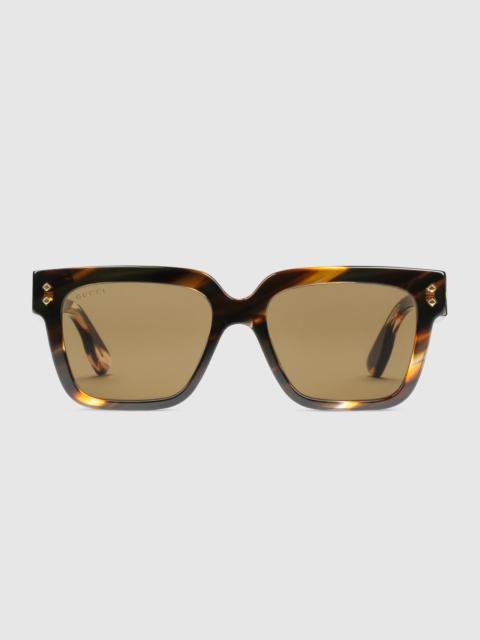 These rectangular-frame sunglasses have a timeless appeal. Crafted from black acetate, they are characterized by subtle gold-toned Gucci lettering and rivets detailing on the frame and temples. A grey lens completes the style with a contemporary feel. - Shiny black acetate frame with Gucci rivets - Shiny black acetate temples with Gucci logo detail and rivets - Solid grey lens - 100% UVA/UVB protection - Frame height: 2"; Frame Width: 5.7" - GG1084S - Temple length: 5.7"; Lens height: 1.7", Nose bridge length: .7" - Made in Italy - The glasses will arrive in a velvet case, available in a range of six jewel-toned colors and paired with a coordinating satin lining. The case color will be individually selected for each pair of glasses and comes with a matching satin flannel pouch and ivory microfiber cloth.