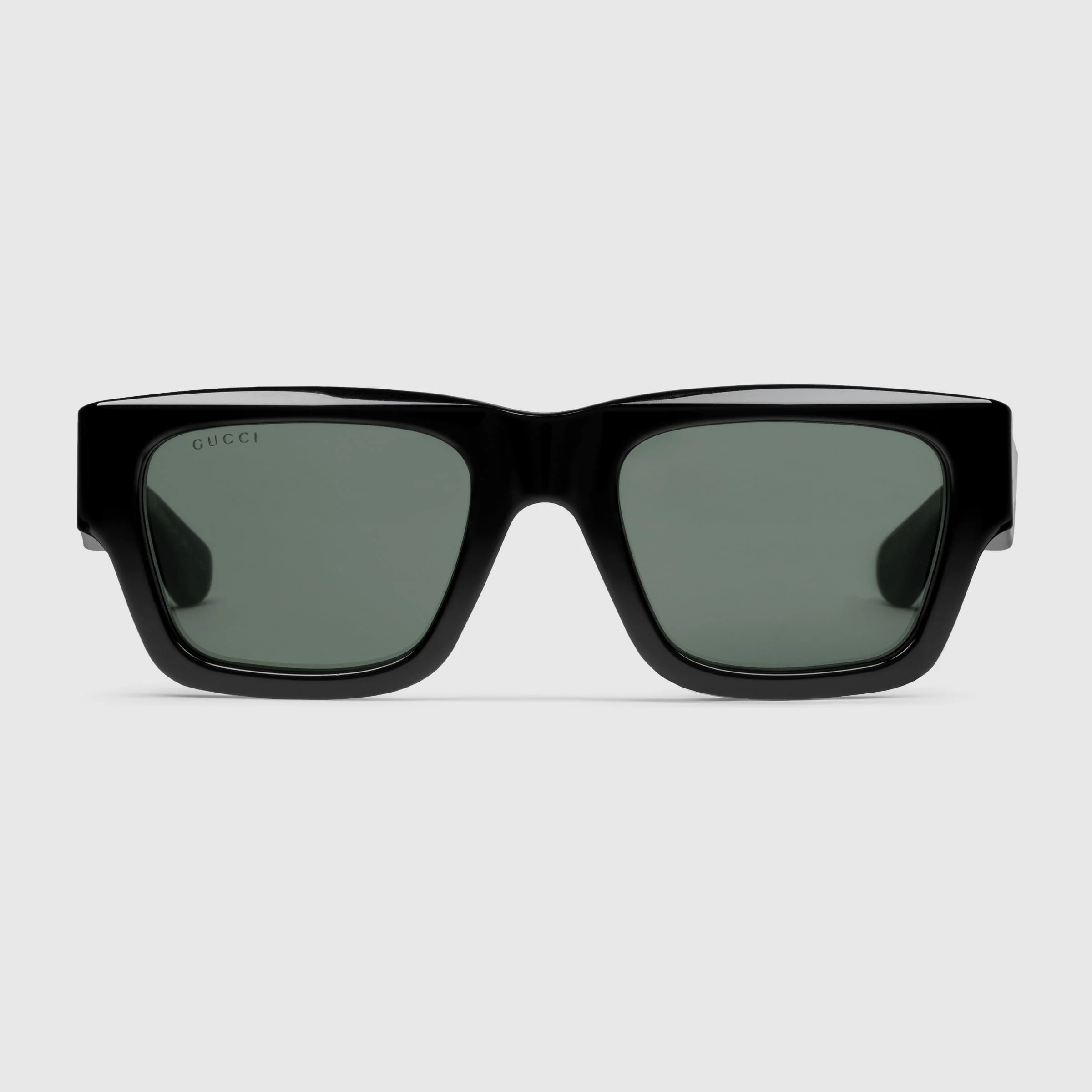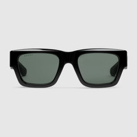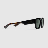 The Pre-Fall 2024 eyewear collection plays on signature colors in a refined silhouette. These rectangular shaped sunglasses present a shiny black frame, highlighting the temples and the tips in two different colors. In this style, the dark tortoiseshell acetate tips and solid grey lenses complement each other. - Shiny black acetate frame - Shiny bi-layer black acetate temples with Gucci logo and dark tortoiseshell acetate tips - Solid grey lens - 100% UVA/UVB protection - GG1668S - Temple length: 5.7"; Lens height: 1.6"; Nose bridge length: 0.8" - Frame height: 1.9"; Frame width: 5.7" - Made in Italy - The Rosso Ancora packaging, a distinctive color chosen by Creative Director Sabato De Sarno to mark the beginning of Gucci's new creative chapter, includes a vinyl case and satin pouch.