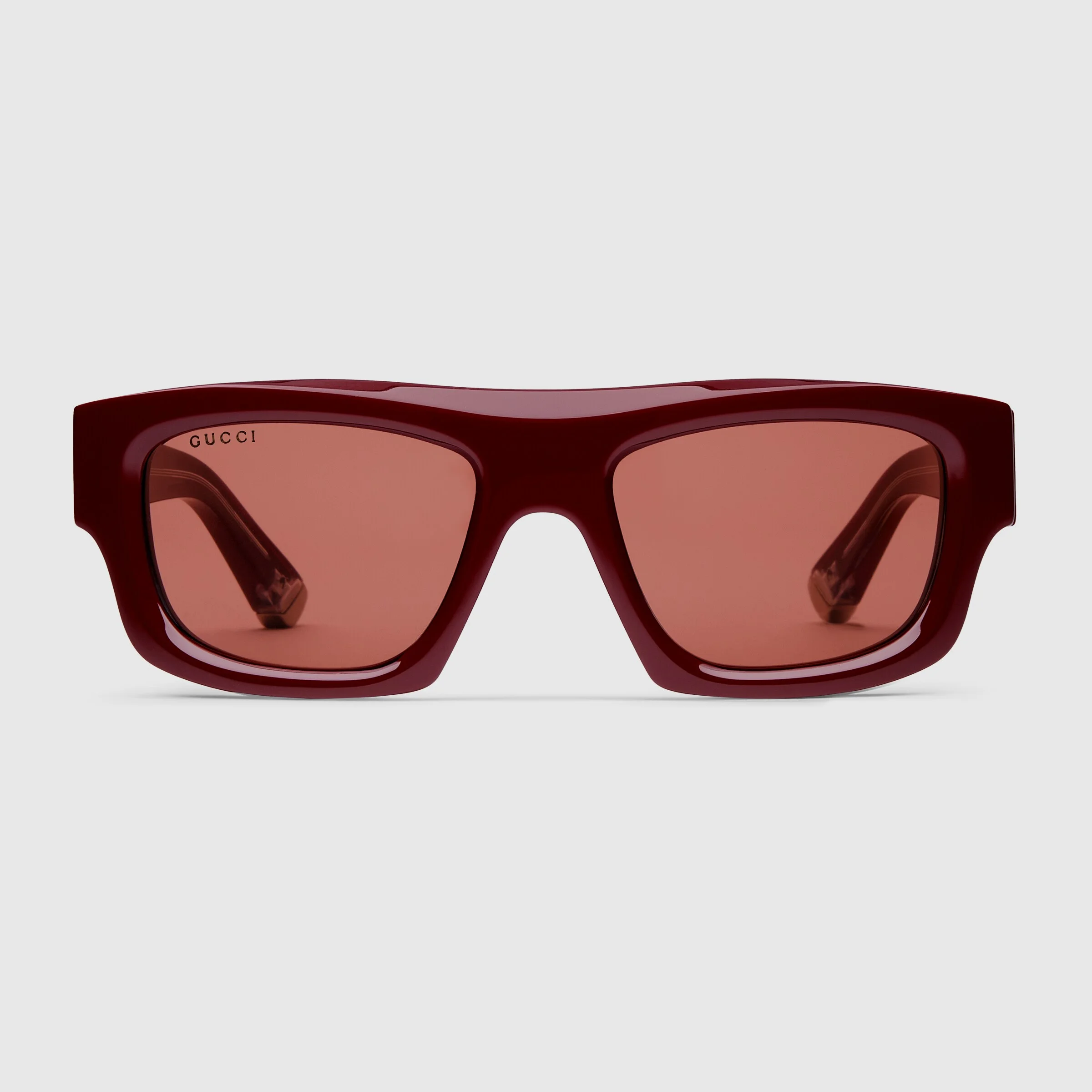 In the Spring Summer 2025 collection, the eyewear pieces blend a rectangular silhouette with signature motifs in an inspired design. Crafted from Gucci Rosso Ancora red acetate, these sunglasses feature a well-proportioned frame and a Gucci script logo detail on the temples. - Gucci Rosso Ancora red acetate frame - Gucci Rosso Ancora red acetate temples with Gucci script and silver metal end tips - Brown lenses - 100% UVA/UVB protection - GG1926S - Temple length: 5.5"; Lens height: 1.5", Nose bridge length: 0.7" - Frame height 1.9"; Frame width 5.7" - Made in Italy - The eyewear case in the House’s signature Rosso Ancora red hue is complete with a magnetic closure and white interior.