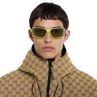 The Pre-Fall 2025 eyewear collection blends a sleek silhouette and signature motifs in a contemporary design. These rectangular sunglasses feature an engraved Gucci logo on metal plaque across the acid green injection temples. - Matte acid green injection frames - Matte acid green injection temples with engraved Gucci logo on metal plaque - Solid green Guccissima lens - 100% UVA/UVB protection - GG2011S - Temple length: 4.5"; Lens height: 1.6"; Nose bridge length: 0.5" - Frame height 1.7"; Frame width 5.6"; Hinge to hinge 5.3" - Made in Italy - The soft black pouch is complete with an elastic drawstring, the Gucci logo and Interlocking G details.