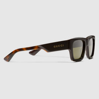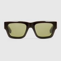 The Pre-Fall 2024 eyewear collection plays on signature colors in a refined silhouette. These rectangular shaped sunglasses present a shiny solid brown frame, highlighting the temples and the tips in two different colors. In this style, the dark tortoiseshell acetate tips and solid green lenses complement each other. - Shiny solid brown acetate frame - Shiny bi-layer solid brown acetate temples with Gucci logo and dark tortoiseshell acetate tips - Solid green lens - 100% UVA/UVB protection - GG1668S - Temple length: 5.7"; Lens height: 1.6"; Nose bridge length: 0.8" - Frame height: 1.9"; Frame width: 5.7" - Made in Italy - The Rosso Ancora packaging, a distinctive color chosen by Creative Director Sabato De Sarno to mark the beginning of Gucci's new creative chapter, includes a vinyl case and satin pouch.