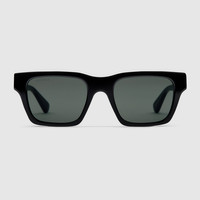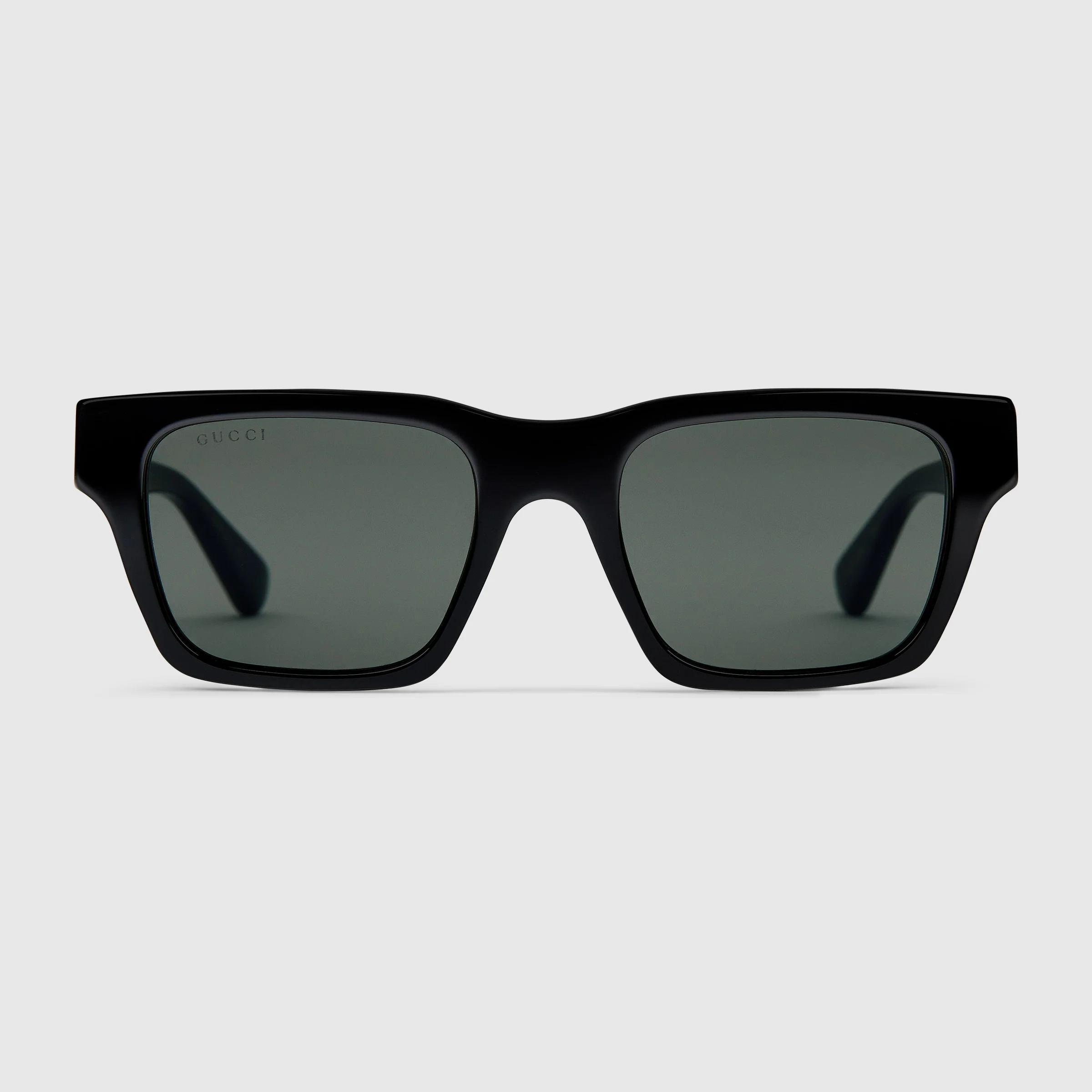 The Cruise 2025 eyewear collection blends an essential silhouette and subtle motifs in a contemporary design. These rectangular sunglasses are accentuated by a discreet Gucci logo and Web detail. - Shiny black acetate frame - Shiny black acetate temples with Gucci logo and Web detail - Solid grey lens - 100% UVA/UVB protection - GG1889S - Temple length: 5.7"; Lens height: 1.6"; Nose bridge length: 0.8" - Frame height: 1.8"; Frame width: 5.7"; Hinge to hinge: 5.3" - Made in Italy - The eyewear case in the House’s signature Gucci Rosso Ancora red hue is complete with a magnetic closure and white interior.