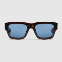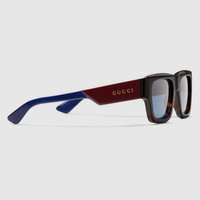 The Pre-Fall 2024 eyewear collection plays on signature colors in a refined silhouette. These rectangular shaped sunglasses present a shiny dark tortoiseshell frame, highlighting the temples and the tips in two different colors. In this style, the solid blue acetate tips and solid blue lenses complement each other. - Shiny dark tortoiseshell acetate frame - Shiny burgundy acetate temples with Gucci logo and solid blue acetate tips - Solid blue lens - 100% UVA/UVB protection - GG1668S - Temple length: 5.7"; Lens height: 1.6"; Nose bridge length: 0.8" - Frame height: 1.9"; Frame width: 5.7" - Made in Italy - The Rosso Ancora packaging, a distinctive color chosen by Creative Director Sabato De Sarno to mark the beginning of Gucci's new creative chapter, includes a vinyl case and satin pouch.
