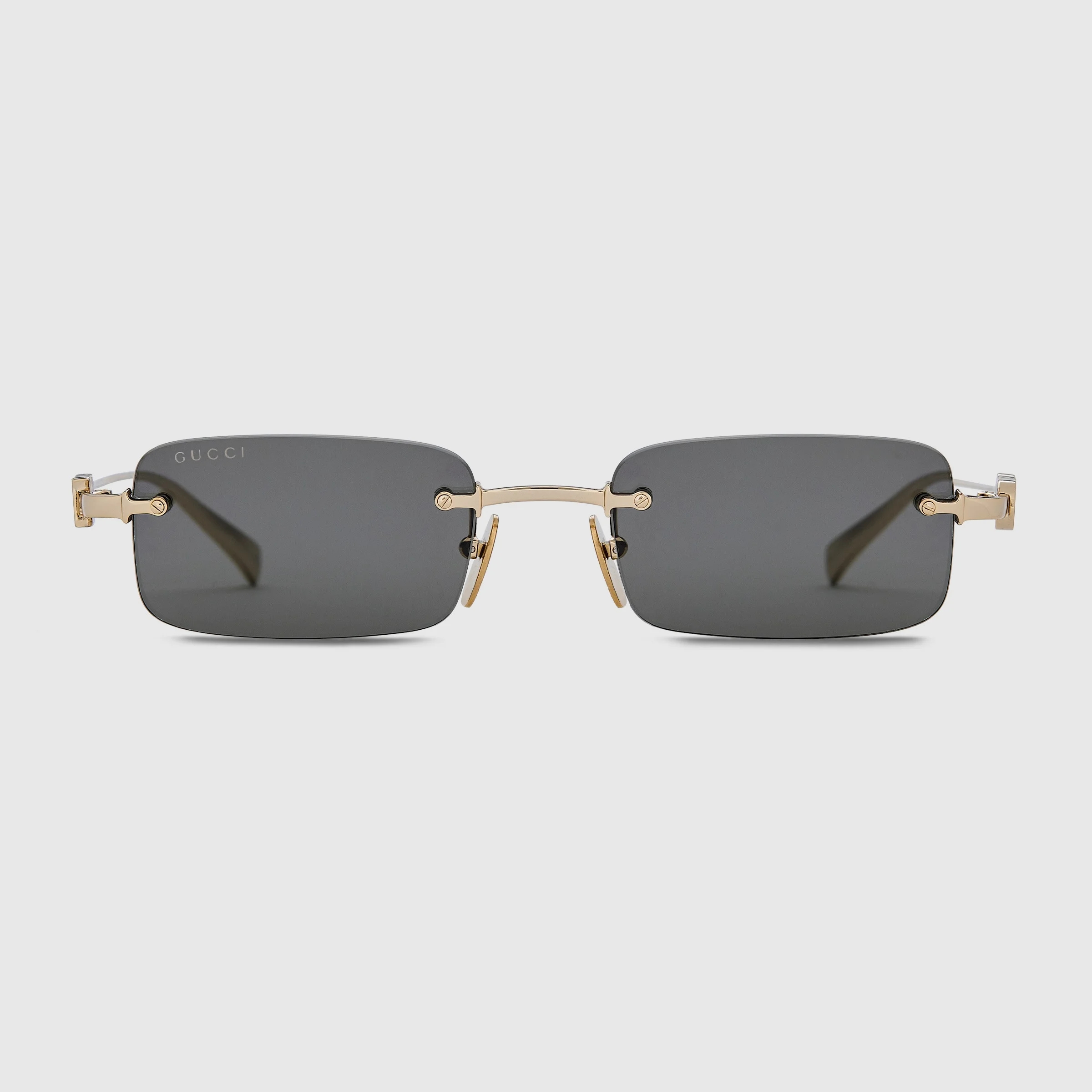 The Cruise 2025 eyewear collection includes a frameless silhouette in a sleek design. These sunglasses feature a Gucci logo on the gold-toned metal temples. - Shiny gold-toned metal frame - Shiny gold-toned metal temples with cut-out Gucci logo - Solid light grey flash lens - 100% UVA/UVB protection - GG1808S - Temple length: 5.7"; Lens height: 1.2"; Nose bridge length: 0.8" - Frame height: 1.2"; Frame width: 5.5"; Hinge to hinge: 5.2" - Made in Japan - The eyewear case in the House’s signature Gucci Rosso Ancora red hue is complete with a magnetic closure and white interior.