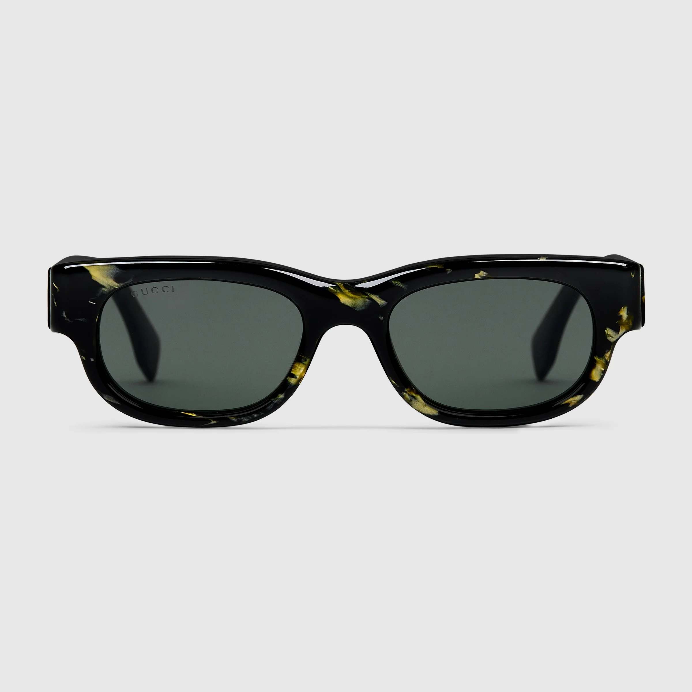 The Cruise 2025 eyewear collection crafts a rectangular silhouette with ReAce acetate for a contemporary design. These sunglasses feature a Gucci logo on the temples. - Shiny black and green tortoiseshell acetate, made of ReAce, a 100% recycled acetate derived from pre consumer acetate scraps - Shiny black and green tortoiseshell acetate temples with Gucci logo - Solid grey lens - 100% UVA/UVB protection - GG1910S - Temple length: 5.9"; Lens height: 1.3"; Nose bridge length: 0.7" - Frame height: 1.7"; Frame width: 5.5"; Hinge to hinge: 5" - Made in Italy - The eyewear case in the House’s signature Gucci Rosso Ancora red hue is complete with a magnetic closure and white interior.