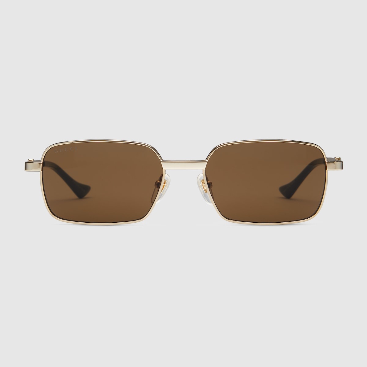 Inspired by the summer spirit and beach clubs on the Italian coast, this item is part of Gucci Lido. This pair of rectangular-frame sunglasses highlights a yellow gold-toned metal frame, green acetate tips, and solid grey lens. Engraved with Gucci lettering, the temples are accentuated with a red and blue Web enamel detail on metal plaque, elevating the design with a nod to the House. - Shiny yellow gold-toned frame - Shiny yellow gold-toned temples with green acetate tips, engraved Gucci lettering, and red and blue Web enamel detail on metal plaque - Solid brown lens - 100% UVA/UVB protection - Frame height: 1.5"; Frame Width: 5.7" - GG1495S - Temple length: 5.7"; Lens height: 1.5", Nose bridge length: 0.7" - Made in Japan - The glasses will arrive in a velvet case, available in a range of six jewel-toned colors and paired with a coordinating satin lining. The case color will be individually selected for each pair of glasses and comes with a matching satin flannel pouch and ivory microfiber cloth.