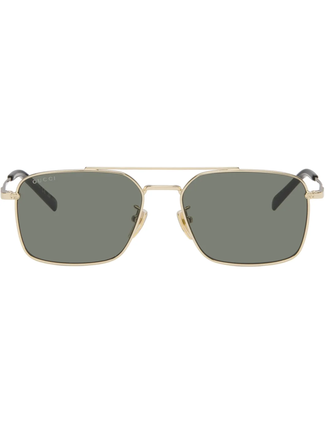Aviator-style metal-frame sunglasses. · Gray lenses · 100% UVA/UVB protection · Logo etched at lens · Top bar · Adjustable rubber nose pads · Logo engraved at temples · Acetate temple tips · Includes pouch · Size: 58.17 145 Supplier color: Gold/Gold/Grey Metal, acetate. Made in Japan 261451M134015