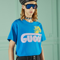 The skunk, a new addition into the whimsical world of Gucci animals, is paired with a retro version of the Gucci logo on this cotton jersey T-shirt. - Royal blue cotton jersey with retro Gucci skunk print - Crewneck - Short sleeves - Made in Italy - The product in this image is shown in a size small