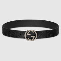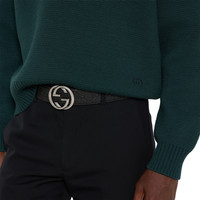 This striking men's belt is presented as part of the Cruise 2026 collection. The Interlocking G hardware offers easy reversibility through a simple pin on the buckle. The palladium-toned finish with a slightly shiny effect further elevates the style. - Black embossed GG leather on one side, black leather on the other - Palladium-toned hardware - Detachable Interlocking G buckle - 1.5" width - Made in Italy - Can be worn as a hip or waist belt. Sizing will differ based on where the belt is worn, please refer to the size guide to find your size.