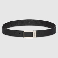 Men's belts with reversible rectangular buckle feature the House's signature motif on one side and leather on the other in neutral shades. Stated in a GG grainy leather and smooth leather, it's defined by a rectangular buckle with Gucci engraving detail. - Black embossed GG grainy leather on one side and black leather on the other - Silver-toned hardware - Rectangular buckle with Gucci engraving - Detachable buckle - 1.3" width - Made in Italy - Can be worn as a hip or waist belt. Sizing will differ based on where the belt is worn, please refer to the size guide to find your size.