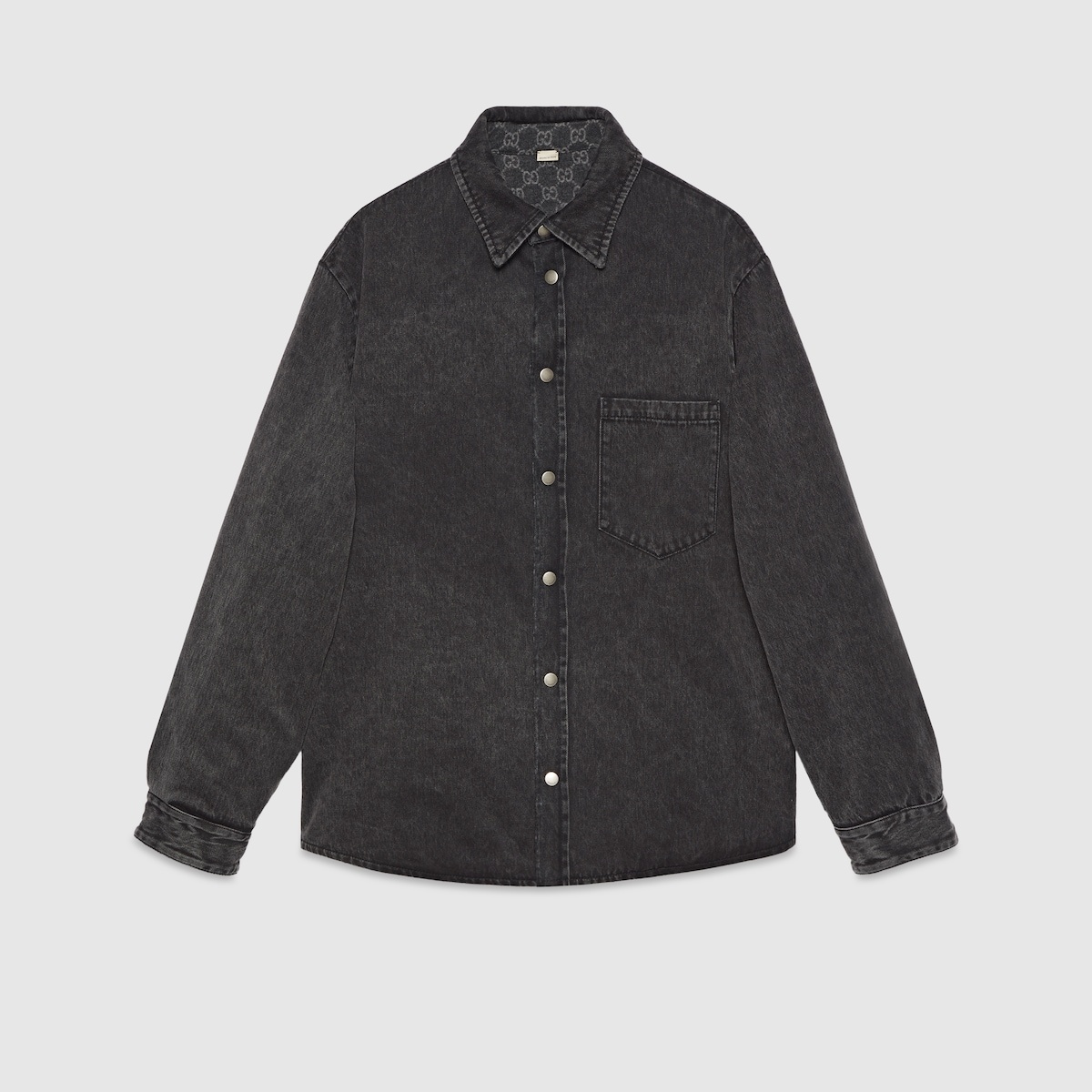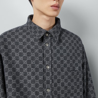 Welcoming warmer days, the men's Cruise 2024 collection presents sportier pieces with vibrant prints. The Web continues to lend an archival touch, while logo details take on bold modernity. This reversible shirt is presented in black denim and reveals a tonal Gucci Made in Italy embroidery. On the reverse, a padded GG flannel fabric makes a bold style statement. - Black denim on the one side - Dark grey and grey padded GG flannel on the other - 'Gucci Made in Italy' embroidery - Point collar - Dropped shoulder - Long sleeves - Patch pocket - Snap button closure - Length: 31.4", based on a size 48 (IT) - Made in Italy - The product shown in this image is a size 48 (IT)