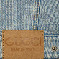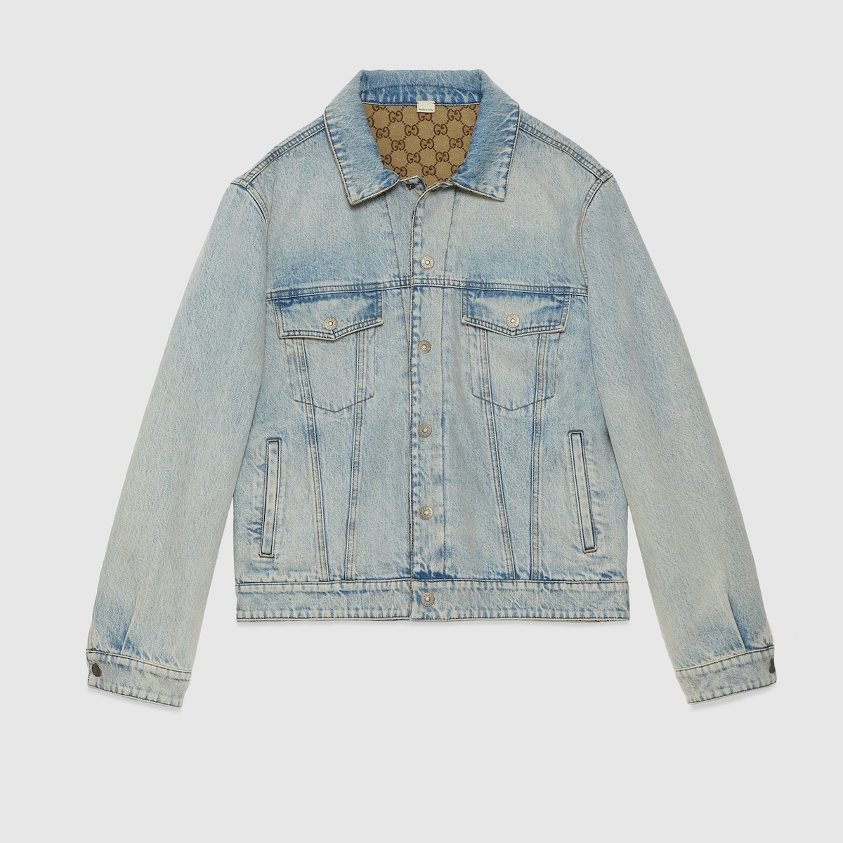 Colors and textures associated with the colder season inspire a new metropolitan wardrobe for Gucci's Cruise 2024 Collection. The menswear selection includes relaxed trousers in cotton and denim, styled with a layering approach, alongside a remodel of the classic overshirt. This reversible denim jacket features light blue denim on one side and GG canvas on the other side. - Light blue denim on one side - Beige and ebony GG canvas on the side - Point collar - Two chest pockets - Two side pockets - 'Gucci Made in Italy' label - Length: 24.8" based on a size 50 (IT) - Made in Italy